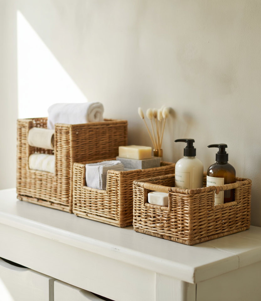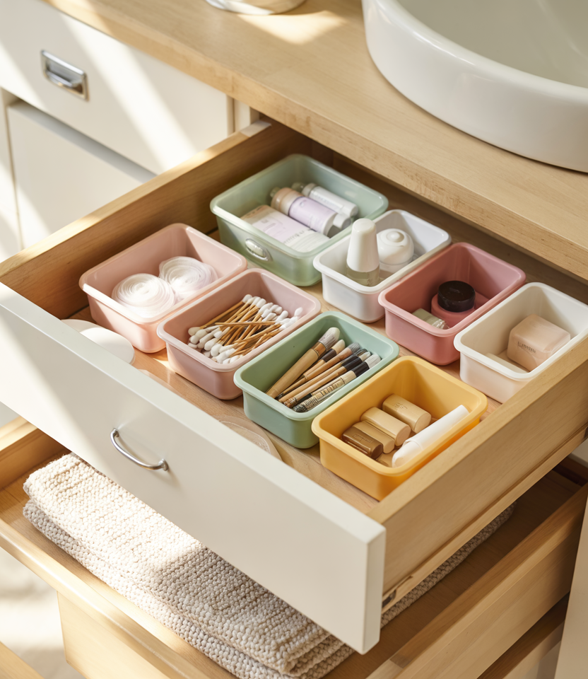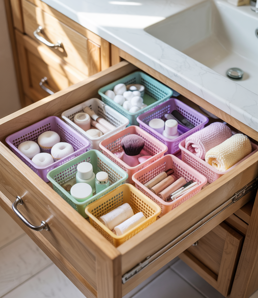 Organizing drawers doesn’t require custom inserts. Simple baskets from a Dollar Tree or classic dollar store bin aisle can transform chaotic stashes of hair ties, razors, or travel bottles. Mix and match sizes to create channels that keep items where they belong, making your morning routine smoother from the moment you open the drawer. Micro anecdote: a friend once told me she thought she had “no drawer space” until she added five tiny baskets. Suddenly, she found duplicates, tossed expired skincare, and had room left over. It’s amazing how clear boundaries change the entire feel.