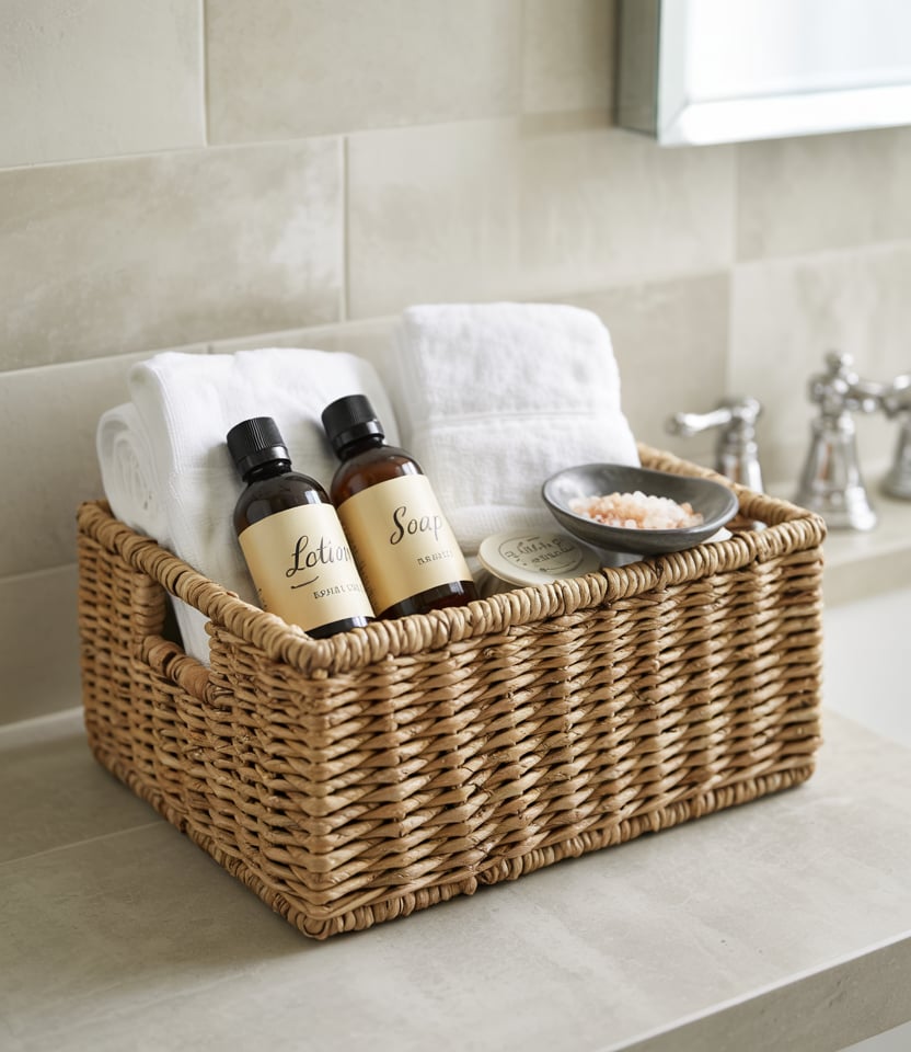 Hosting becomes easier when you create a thoughtful guest basket filled with the basics. Style it with pieces inspired by guest prep guides and small DIY touches like handmade labels or mini kits. It’s a warm detail that immediately welcomes visitors and keeps them from rummaging through cabinets. American regional context: in many suburban homes, guest rooms share a hall bathroom. A basket gives visitors instant access to essentials—like toothpaste or cotton pads—without needing to ask.