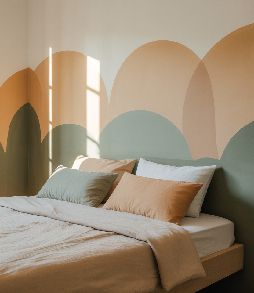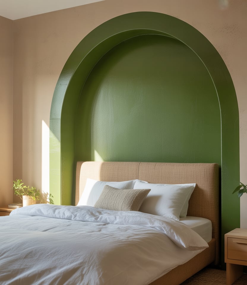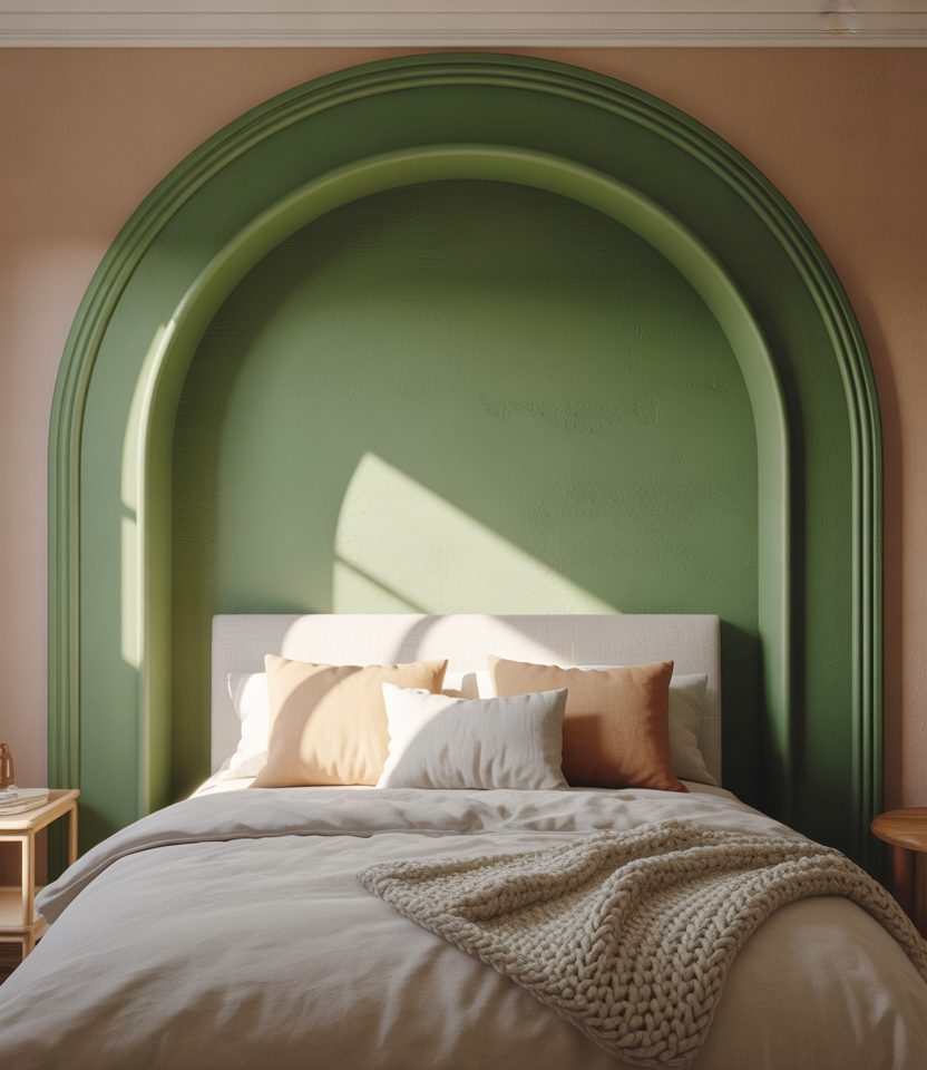 A painted arch fakes custom millwork for pennies. Choose moss green, clay, or powder blue colors and center the curve behind the bed. This is the DIY bed. softens boxy rooms and complements plain drywall or wainscoting. the bed. wainscoting. Among fast paint ideas, it’s viral for a reason: tape, roll, done. In spaces with window glare, matte paint keeps the edge velvety, while low headboards let the arch shine in everyday designs.
