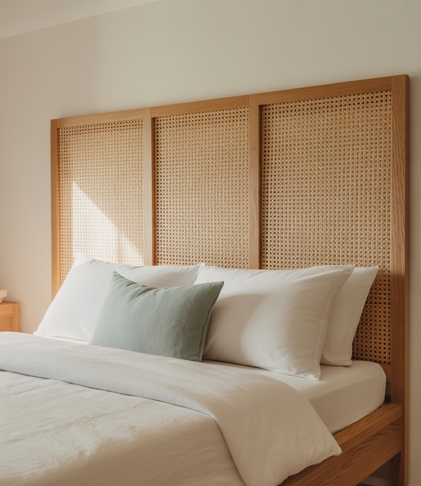 Mount a slim wood frame and infill with cane for airy texture behind the bed. Surrwainscoting. the bed. ounding paint in creamy Primary neutrals let the bed. lets the cane glow; a green throw ties nature in. Panels are easy to swap, making this friendly for DIY ideas and renters with window breezes. The look feels custom without carpentry overload—an understated 2026 classic in layered designs.