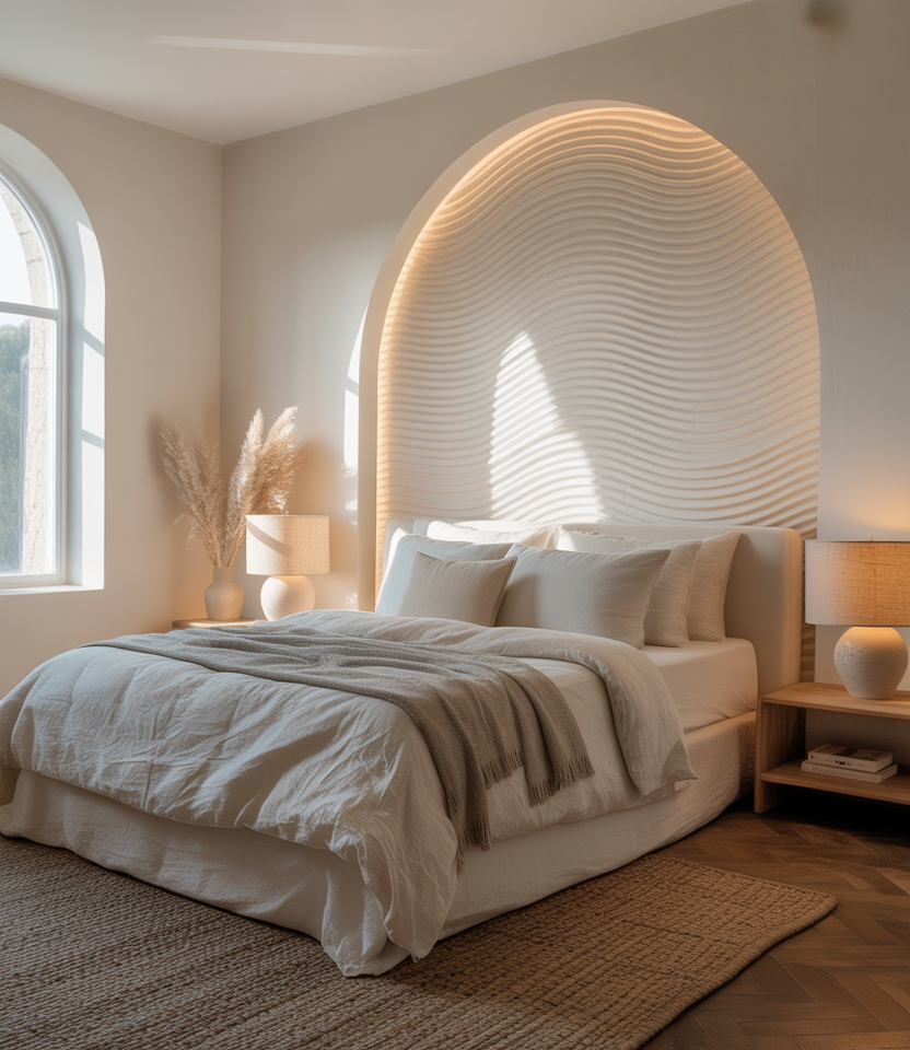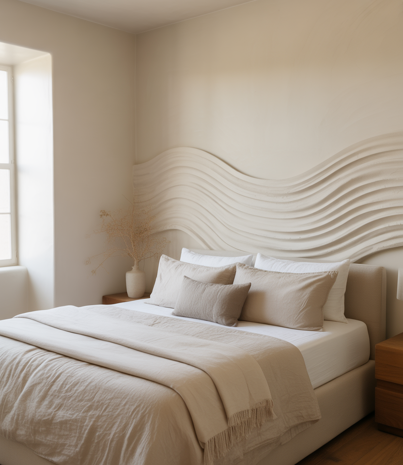 Hand-troweled waves create a gallery feel behind the bed. Keep DIY ideas in the bed. Paint it warm white or whisper green so side light from a window the bed. window traces the relief. This artisanal surface is art and architecture at once, a 2026 favorite for tactile designs that stay quiet at night. Pair with stone, linen, and dimmable lamps. It’s bespoke without ornate trim, and repairs are straightforward—another plus for practical ideas. window-ideas lovers.