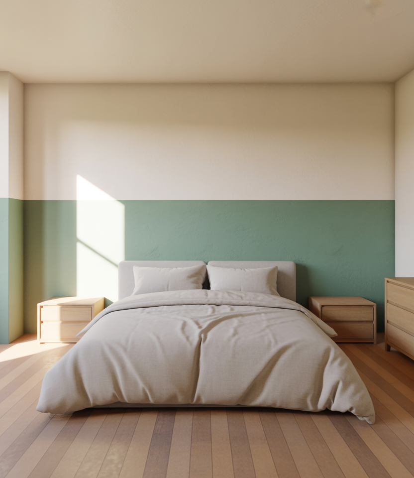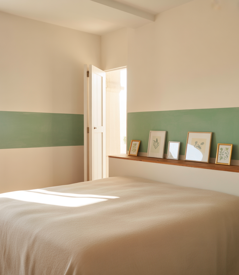 Split the wall with a mid-tone below and a bespoke color above that is airy. This paint trick lightens rooms with a window and also frames headboards behind beds with colored beds, which is a budget idea that can be DIY’ed, and it ranks high for this too. For paint color in 2026, sage green plus warm white are dependable. The horizontal line can also meet sill height, adding instant “architecture.” The art should be kept simple, and the block is the statement bed, which is easy to repaint if tastes change.