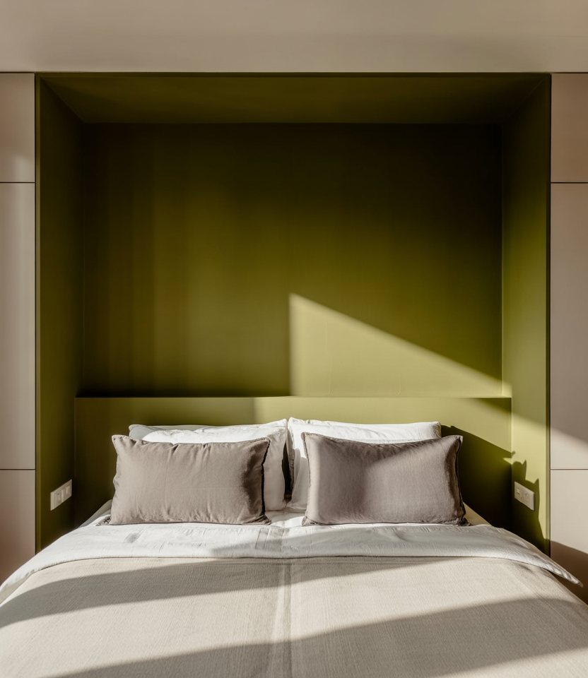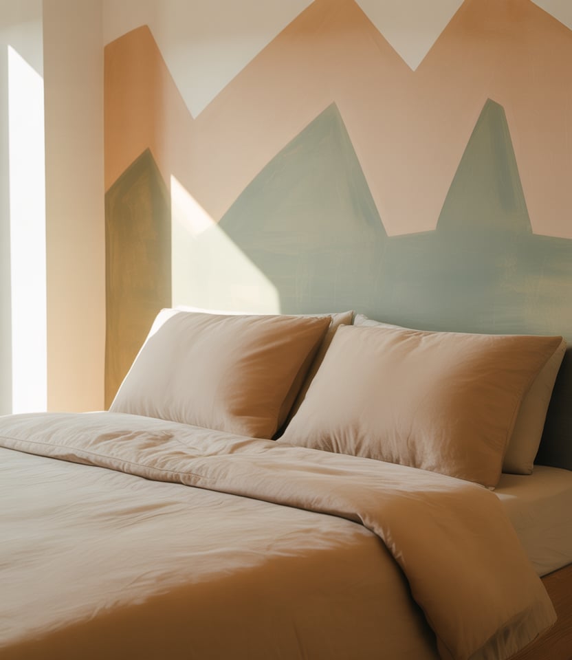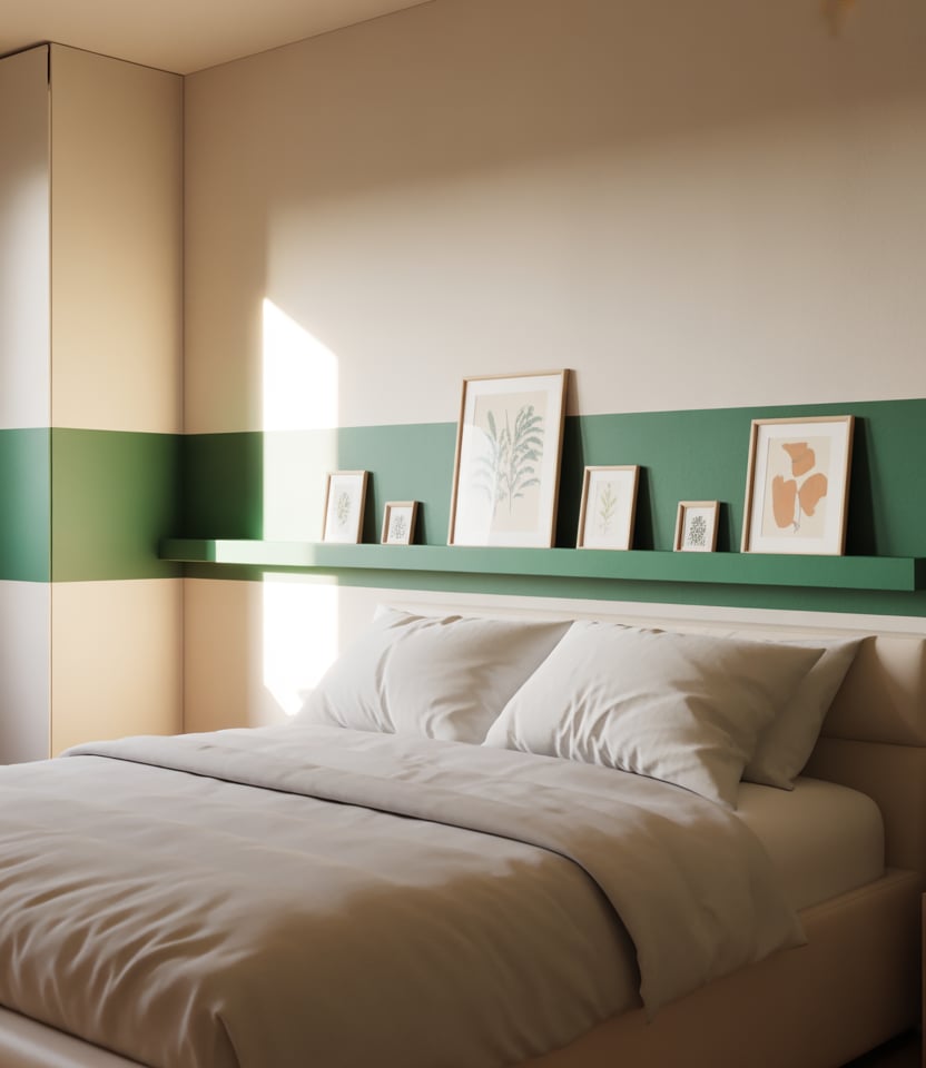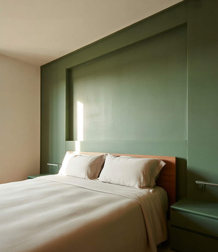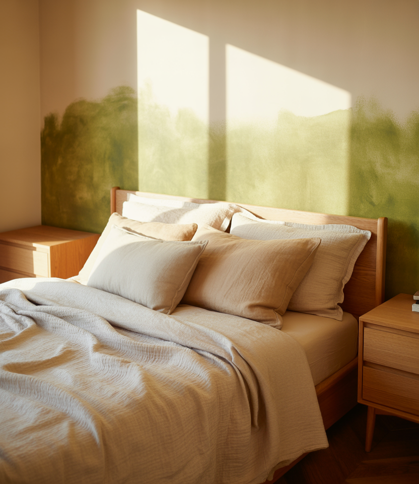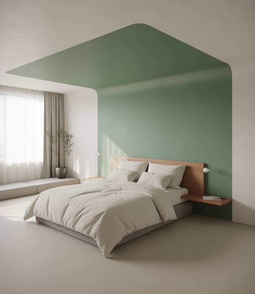 Wrap paint across the main wall and the return to hug the bed behind the bed. Leafy green, stone, or clay colors keep it grounded while the corner trick expands the zone visually. In spaces with window light, the return wall shifts tone through the day—subtle drama. This is a zero-trim, high-impact move for minimal designs and quick DIY refreshes.