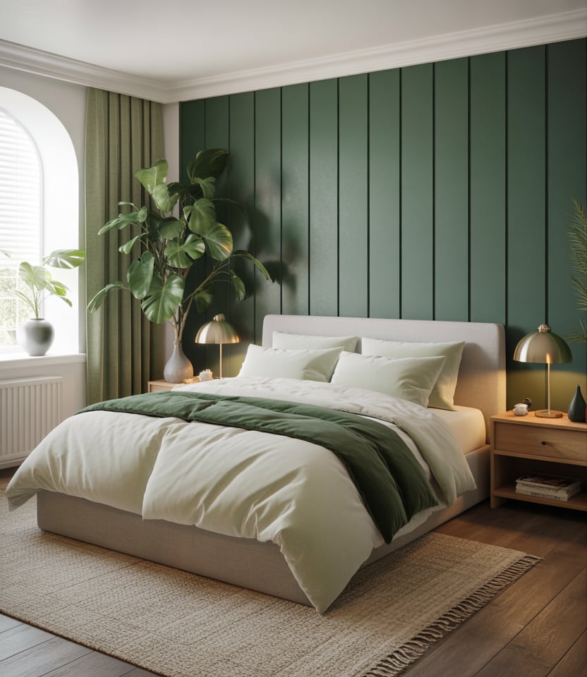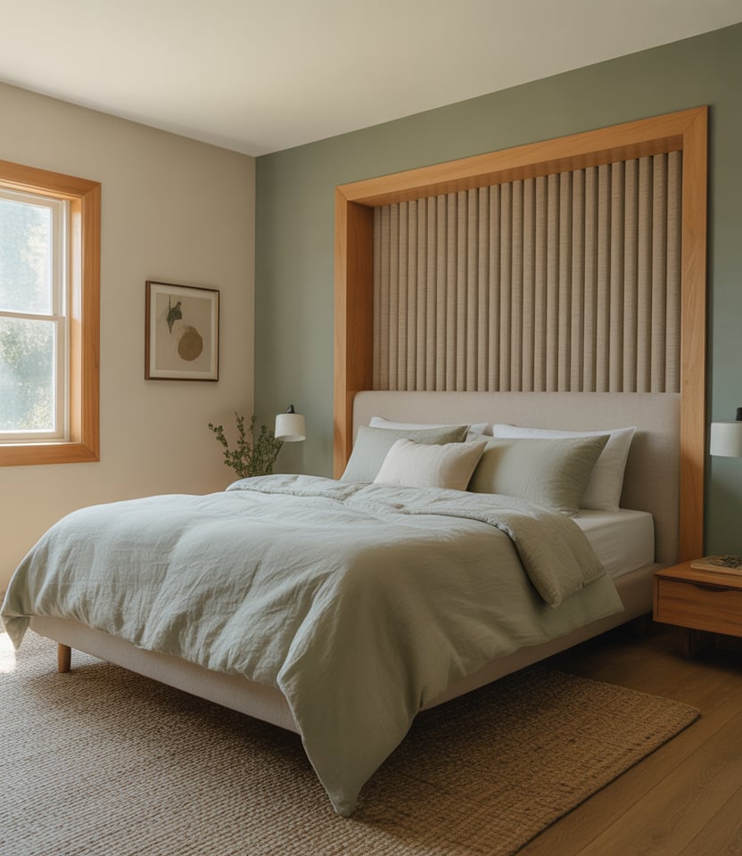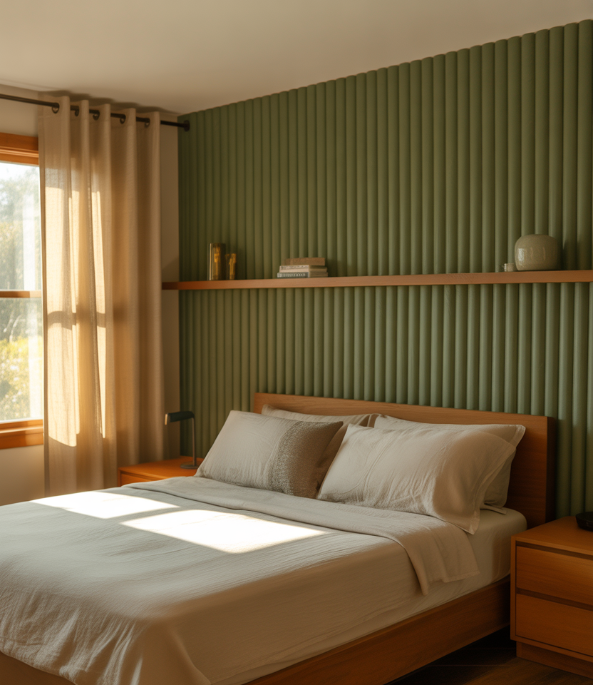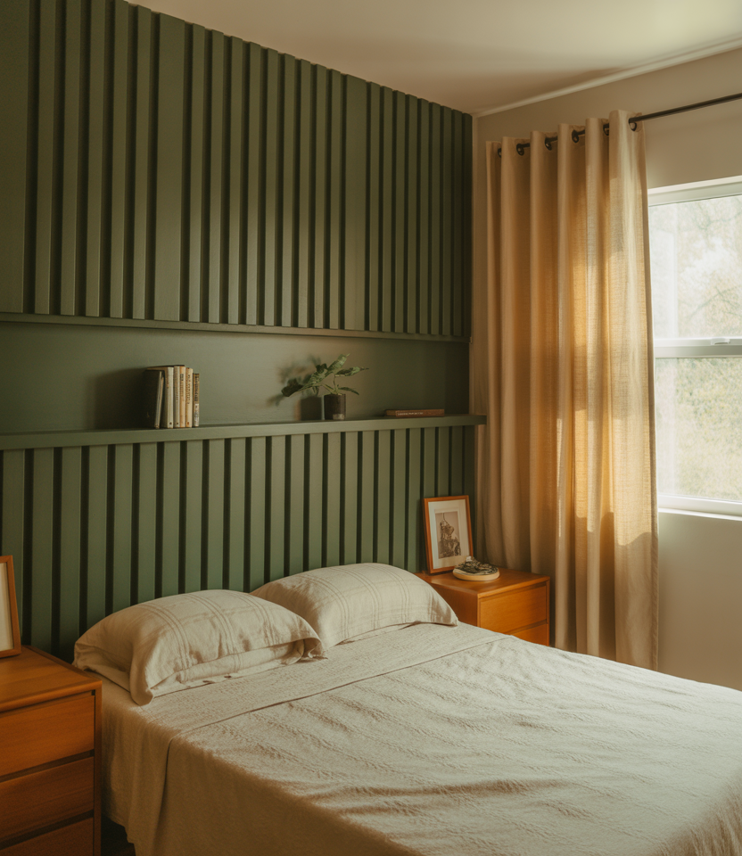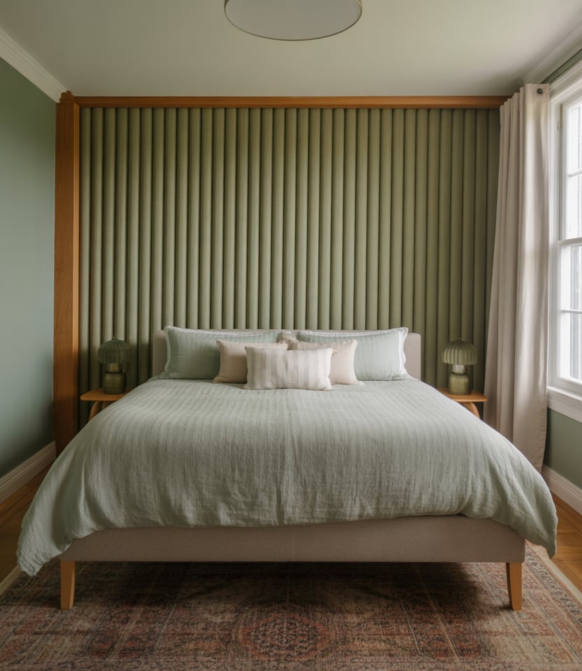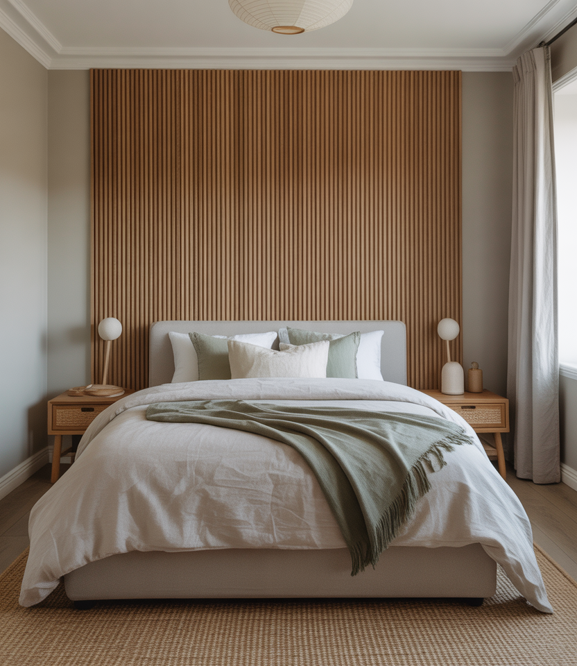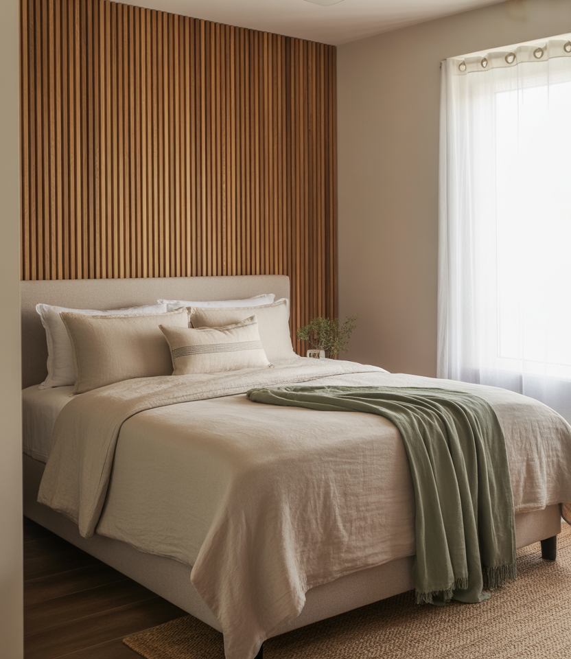 The vertical slats provide rhythm while also adding height and soft acoustics behind the bed. Choose oak or a faux-slat wallpaper if you are renting, both of which give you the tone-on-tone shades that elongate the walls with window-side feels like side light. The calm neutral paint lets a single green throw tie in nature. This is a 2026 staple because it looks bespoke but can be installed in a weekend—ideal for clean-lined designs that still feel warm and handmade.