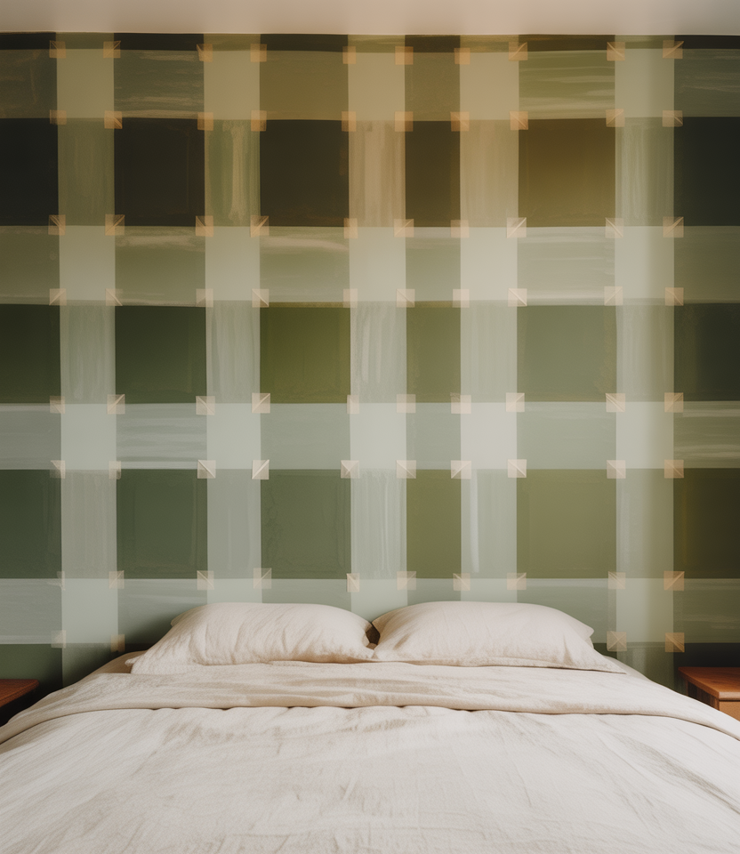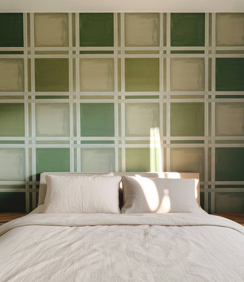 Create oversized plaid using two close paint hues plus a translucent glaze behind the bed. Earthy colors or muted green keep it cozy, not cute. Tape lines give a crisp read with window light, while the headboard edits the pattern. It’s a satisfying DIY idea for a rainy Saturday—bold when you want it, easy to repaint when you don’t. Add one brass sconce for a little sparkle.