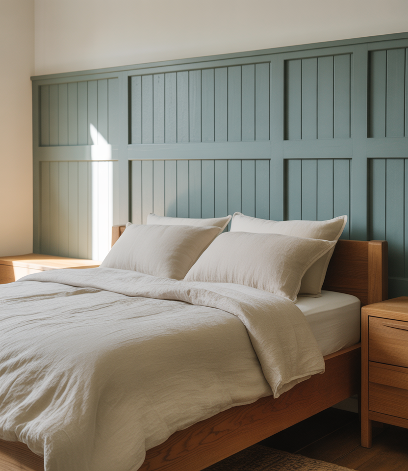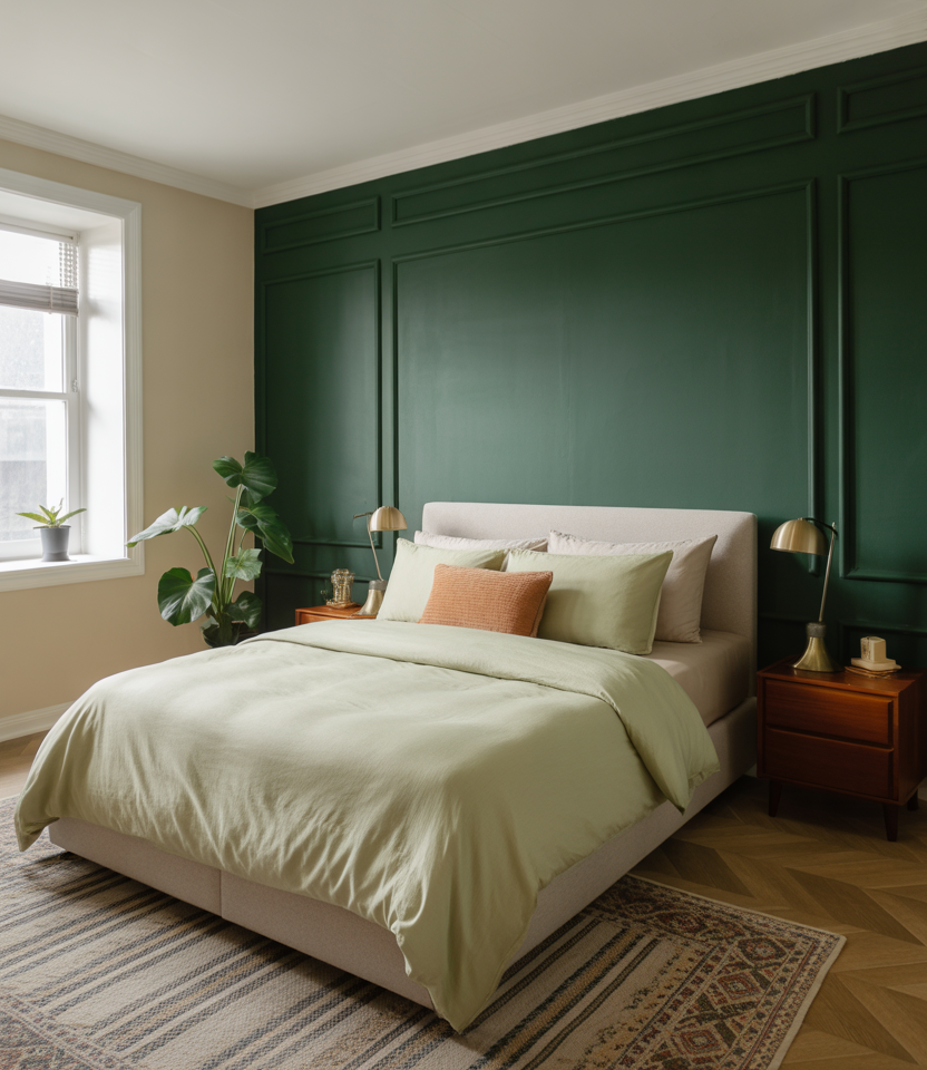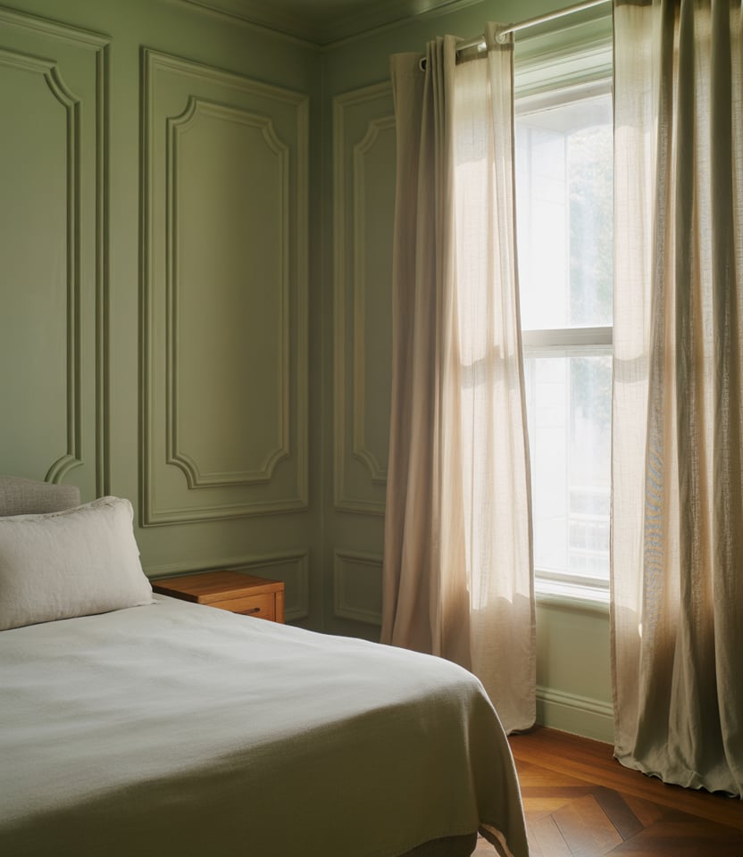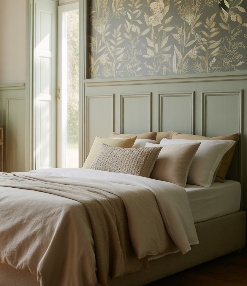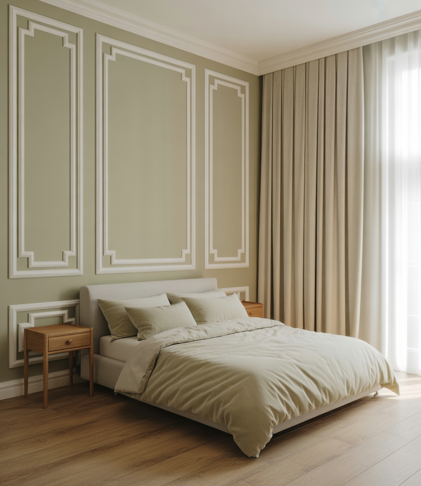 Apply thin rectangles of molding, then bathe the wall in one hue behind the bed. Soft green or mushroom colors read Paris-calm, a perennial among paint ideas. The shadow lines are the ornament; keep art minimal. Works with window drapery and linen shades. This look is cost-smart but feels heirloom, a 2026 lesson in restraint for collected designs.