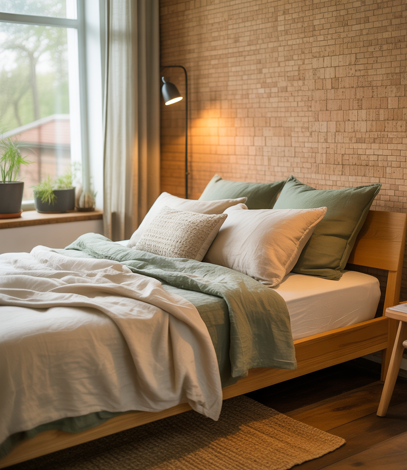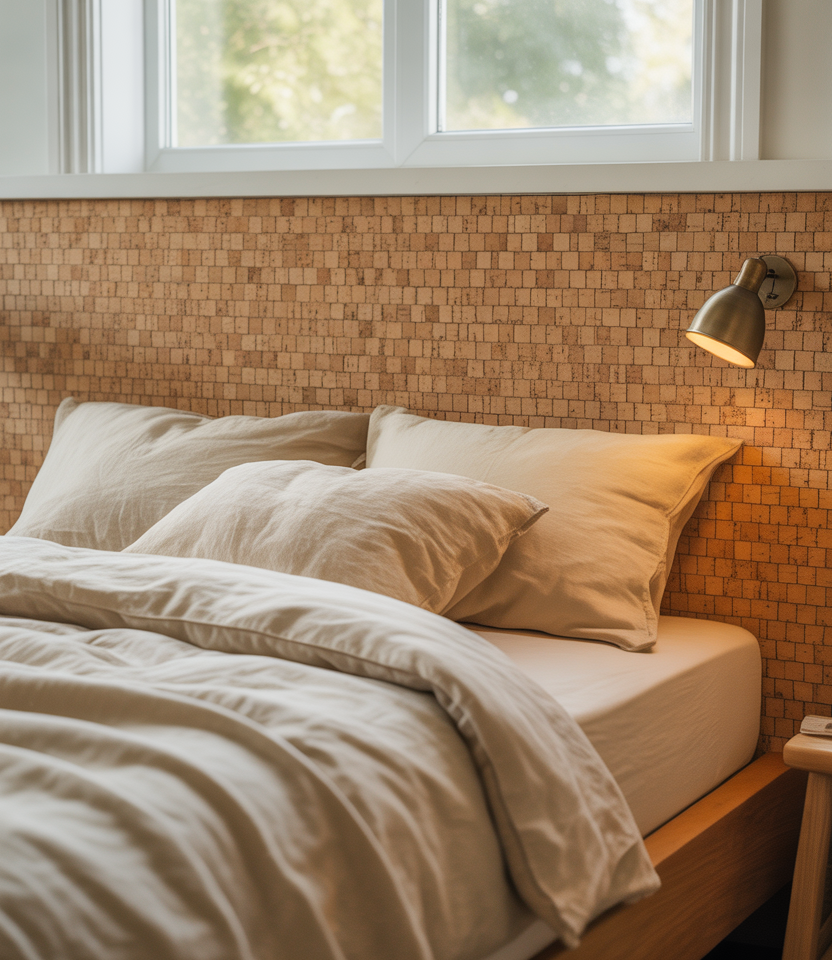 Acoustic cork mini-tiles add a natural pattern and pin-up function behind the bed. Whitewash with diluted paint or leave warm colors; both feel current in 2026. Cork partners well with window drapery and linen, and it’s a sustainability win. Ideally, DIY crews can handle a whole wall in an afternoon, then style it with a single metal sconce for glow—humble texture, big charm in everyday designs.