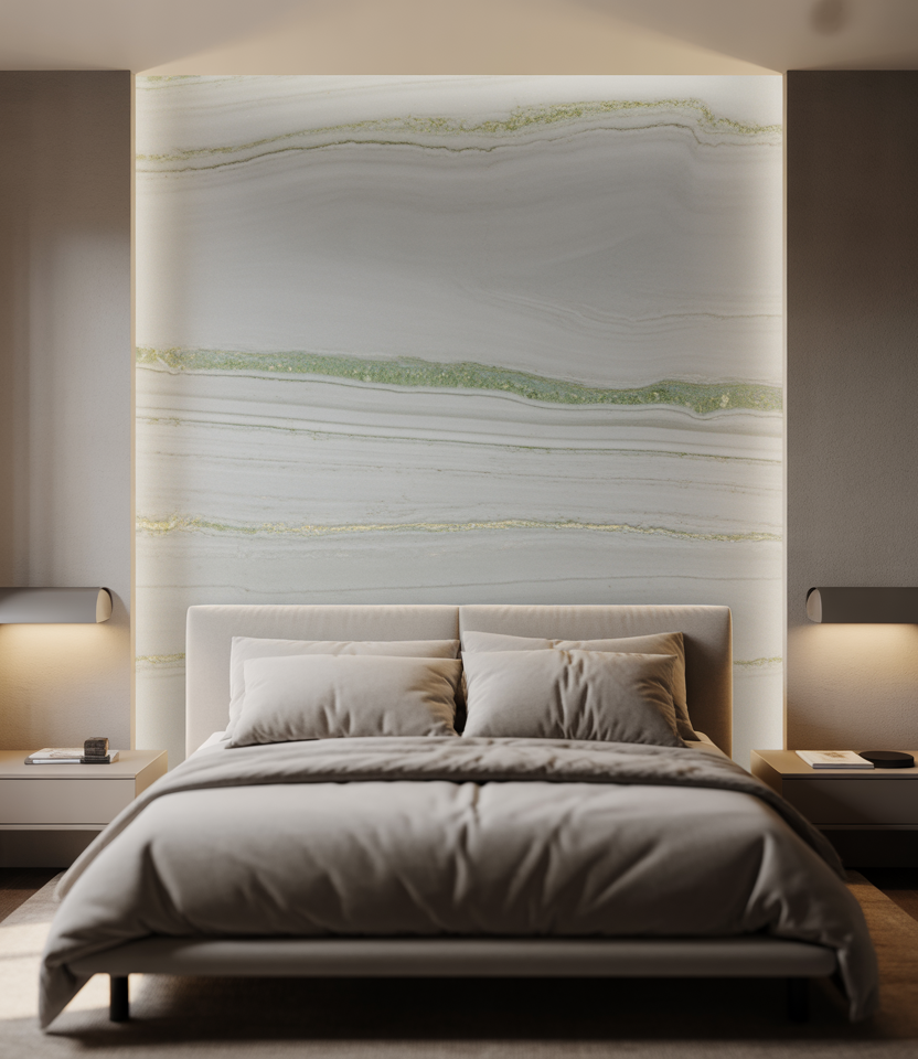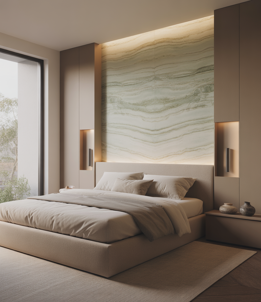A thin stone or porcelain slab behind the bed gives spa serenity. Choose honed surfaces and quiet colors—a whispery green vein adds nature without noise. Keep adjacent paint simple and let integrated sconces handle sparkle. With a window nearby, light skims the texture for subtle theater. It’s 2026 luxury scaled to normal budgets and room sizes—enduring designs you won’t tire of.