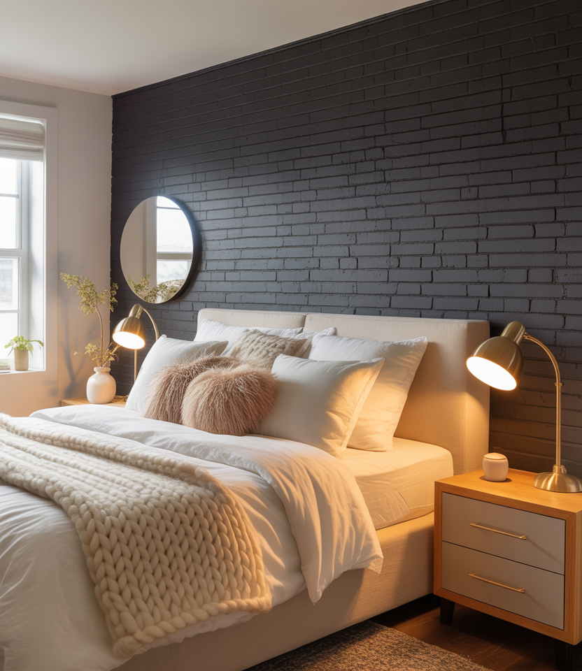 Matte charcoal is gentler than pure black and design black, adding depth without swallowing light. Use scrubbable paint behind the bed and black; the bed keeps ceilings bright. Warm bulbs prevent a chilly cast, while pale linens lift the palette. In designs for small rooms with windows, the bed, windows, and charcoal recede visually, making space feel larger. Add a small wall mirror to glance at a window, glance at a window, and glance at a window glowing at night—subtle drama, 2026-ready colors.