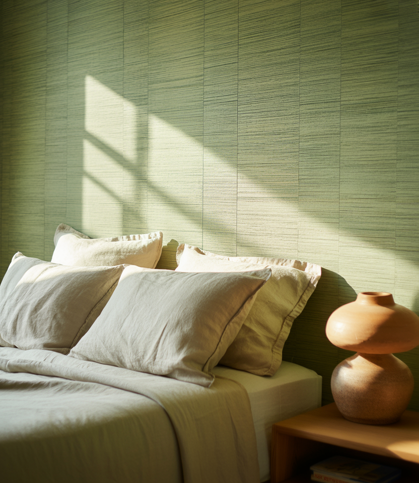 Faux grasscloth wallpaper offers organic weave without humidity worries. Place it behind the bed for the window—the bed texture that hides scuffs. Choose sandy or sage green colors; peel-and-stick paper keeps it flexible for renters and DIY fans. The subtle horizontal line widens tight rooms with window light skimming the surface. Pair with percale sheets and a ceramic lamp to keep the vibe grounded.