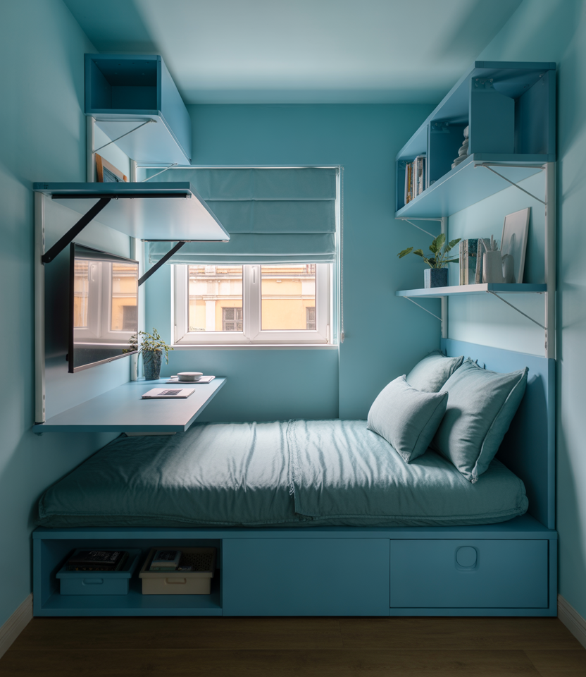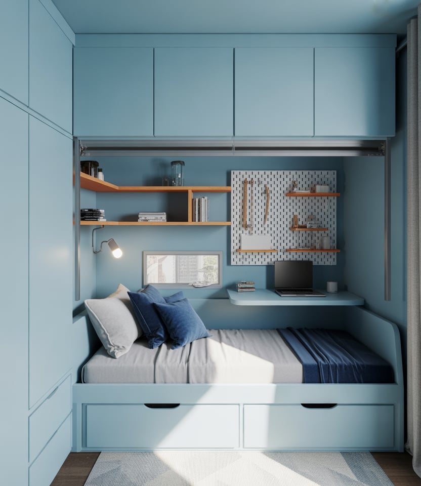 Finally, for someone who uses their bedroom not only for sleep but also as a creative DIY workspace, craft a cozy, functional small room with a fold-down desk, a comfortable bed (or loaf-style lounge bed for reading and relaxing), and integrated storage that keeps tools and materials hidden away when not in use. Use a muted color palette (soft blues trending in 2026) to anchor the space while allowing pops of personality via wall art or craft shelving. Designers note 2026’s emphasis on rooms that evolve into day-use and restful zones. This type of layout is especially suited to singles or couples who work from home and live in smaller spaces.