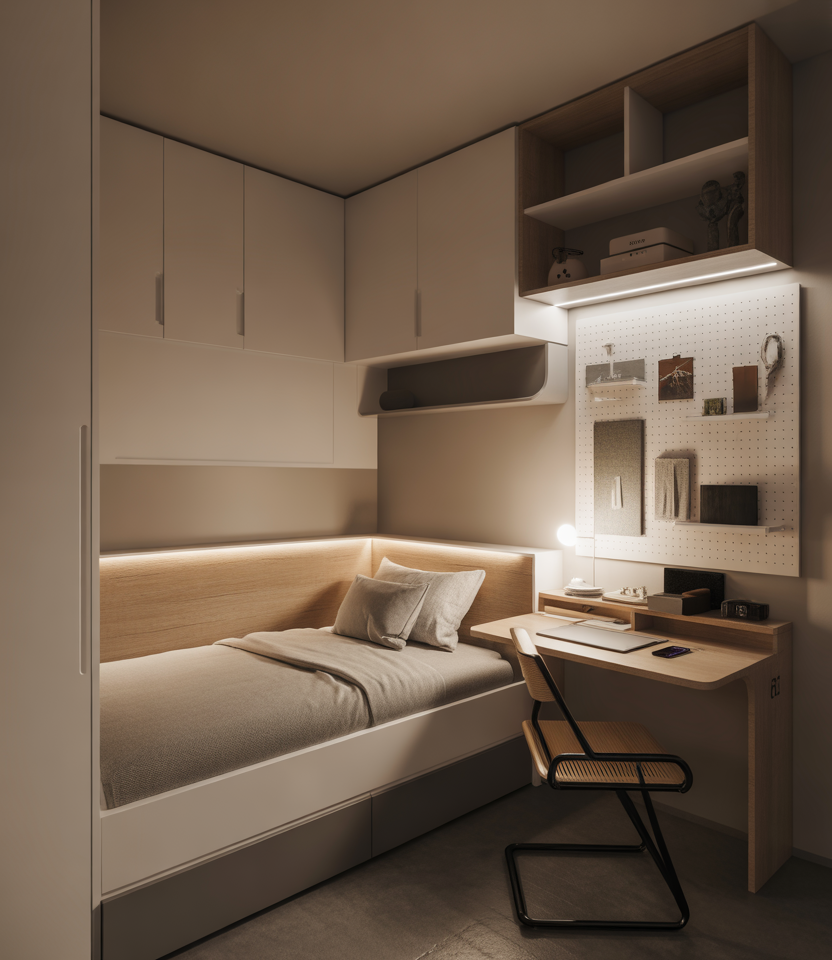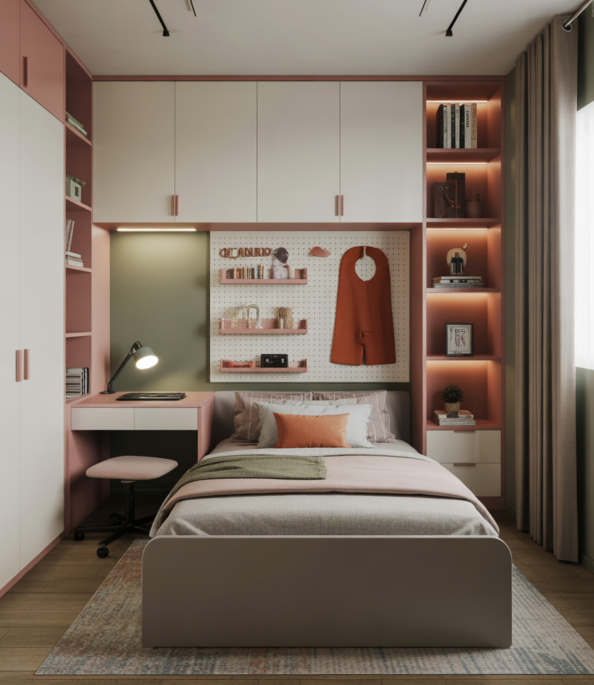 For teens who crave both privacy and connectivity, the 2026 small-bedroom trend leans toward smart lighting, modular furniture, and sleek surfaces. Pair a cozy single bed with LED strips, wall-mounted chargers, and fold-out desks. This aesthetic combines tech convenience with comfort, making even a tiny room feel future-ready. A budget-friendly setup using Bluetooth lighting and DIY pegboard organization keeps things tidy yet expressive.