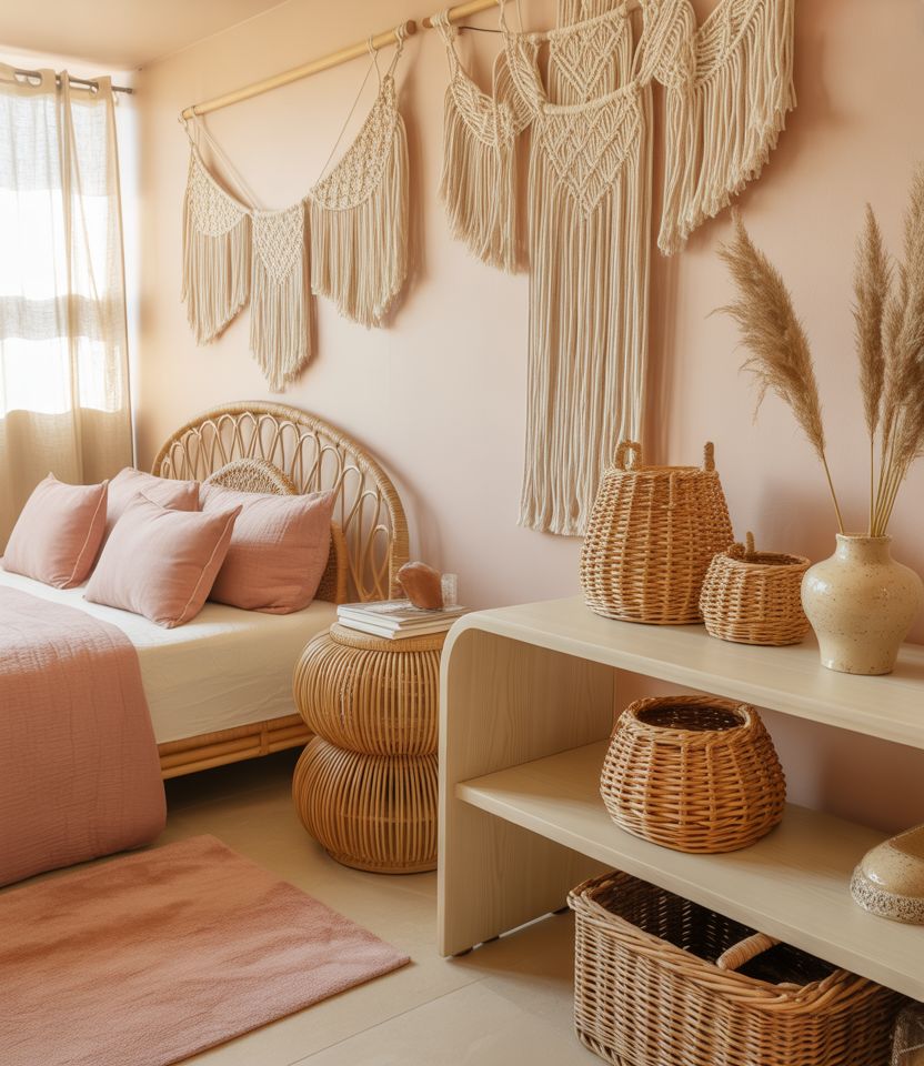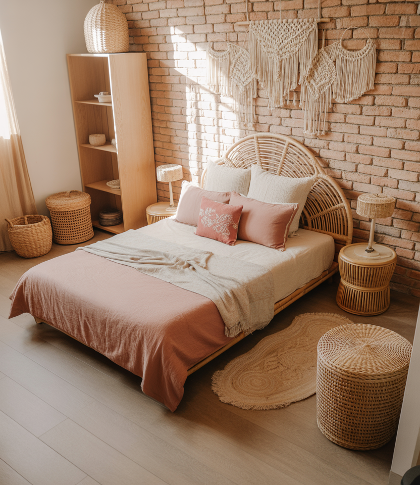 Create a cozy pink sanctuary that fuses boho textures with loft-style simplicity. Use macrame, rattan furniture, and cheap flea-market finds to add soul. The low bed and woven baskets save floor space, while layered textiles invite lounging. A mix of pastel tones and warm wood gives the small room a cheerful lift. Perfect for renters who love DIY decor and effortless cozy charm—think “artist’s loft meets tropical calm.”