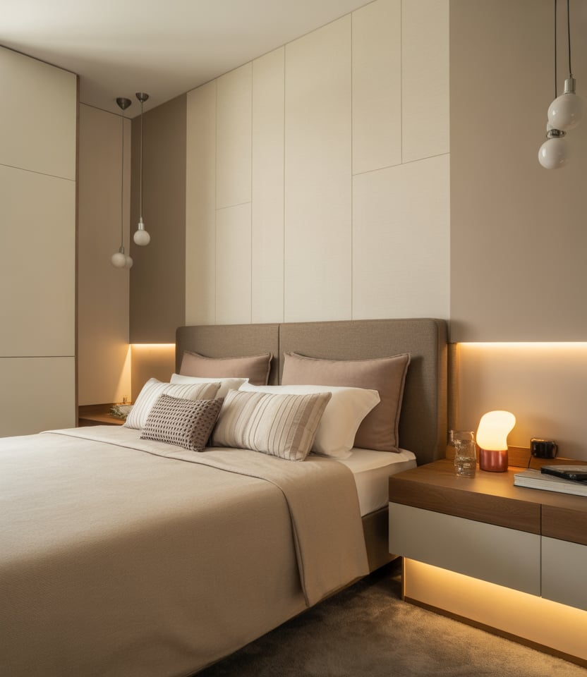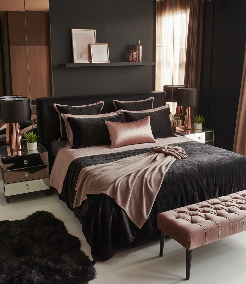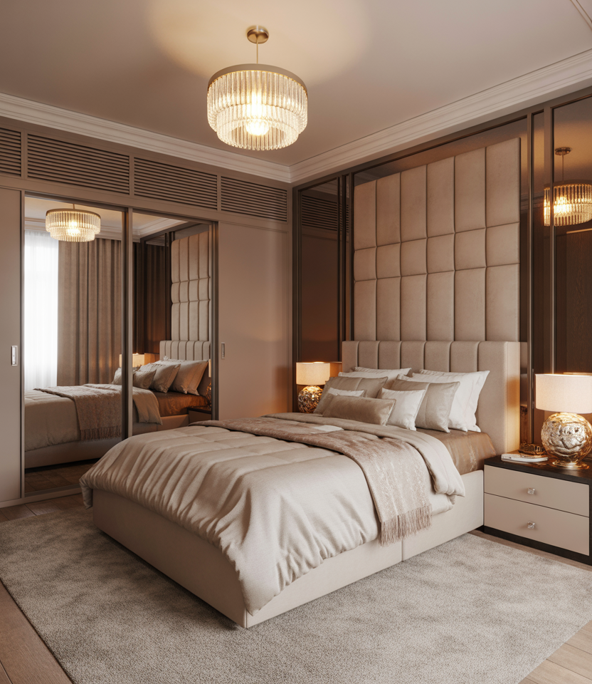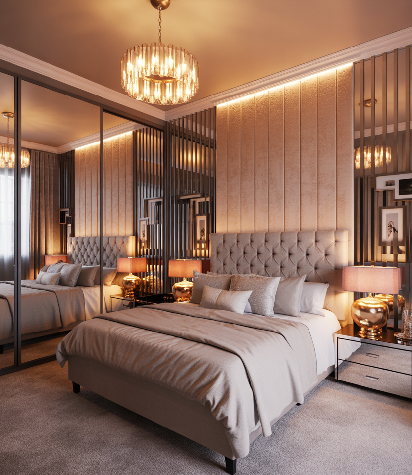 Transform a snug bedroom into a cozy mini-suite with plush bedding, mirrored closet doors, and layered lighting. Metallic trims and a tufted headboard add a luxe aesthetic without requiring much space. Couples can choose tone-on-tone hues such as cream and champagne for sophistication. Opt for slimline side tables and hanging lamps to free surfaces. This look is budget-friendly yet feels indulgent—a boutique hotel at home.
