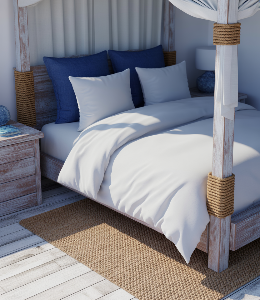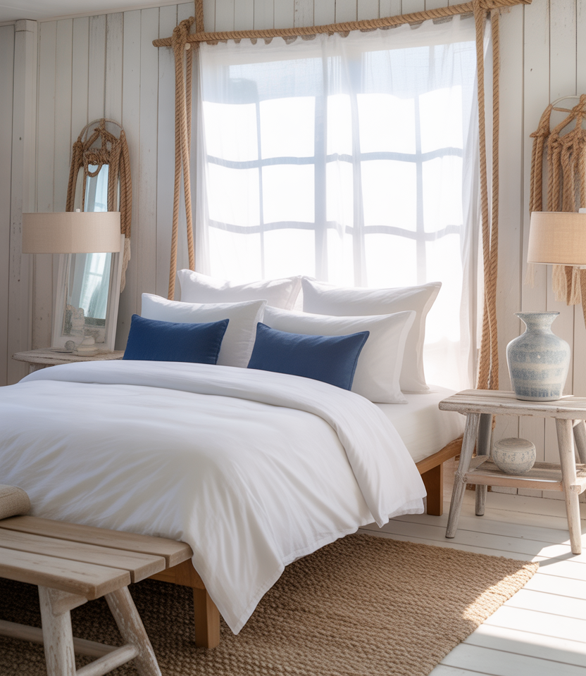 Bring a seaside calm to your compact room with a low loft bed, whitewashed wood, and oceanic hues. This cozy coastal style celebrates airiness, sunlight, and relaxation. Add linen curtains, rope décor, and woven rugs for texture. It’s cheap to achieve—simple paint, thrifted baskets, and shell accents do the job. Ideal for singles or couples who want a fresh, breezy aesthetic that never feels cramped.