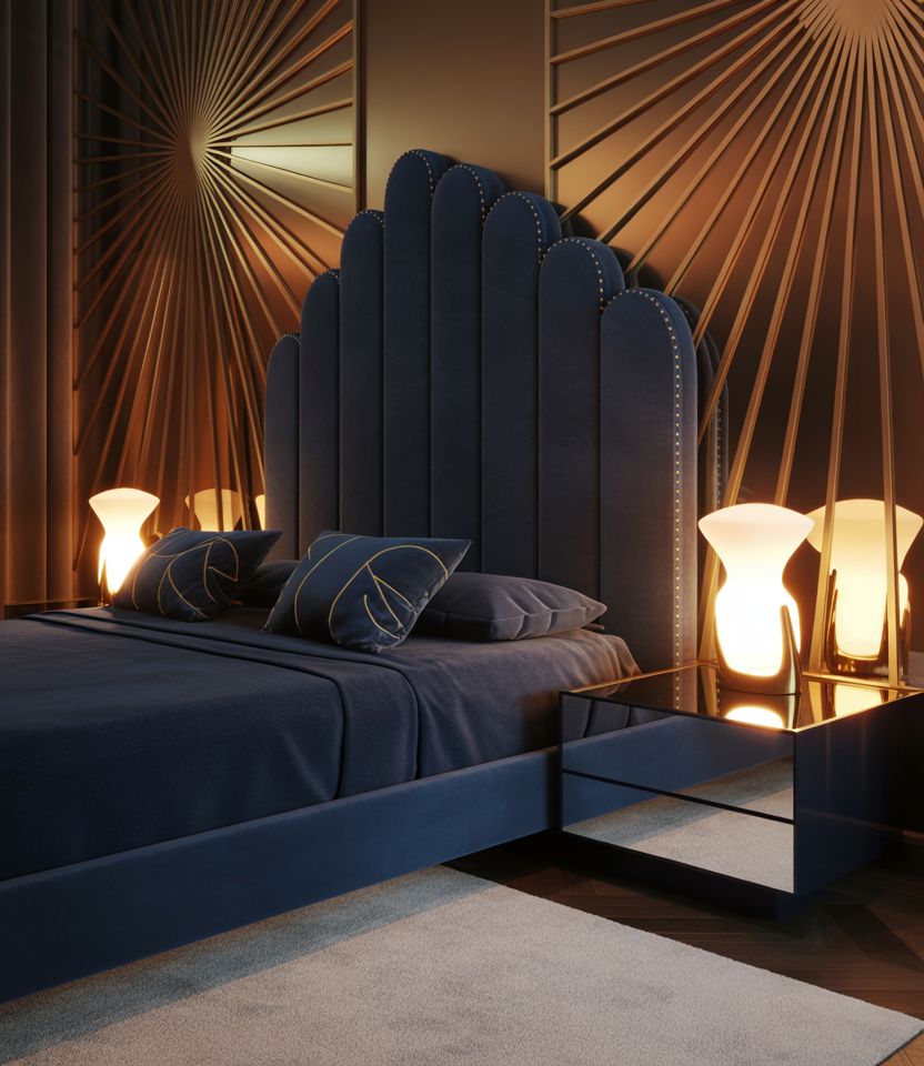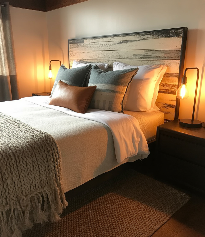 Art-inspired bedrooms are back. This Art Deco-influenced cozy space merges sculptural lighting, curved beds, and deep women’s color schemes and blue-toned color palettes. Brass fixtures and geometric mirrors expand light and drama. To stay budget-friendly, choose peel-and-stick wallpapers and thrifted lamps. Perfect for couples who love cinematic elegance without clutter.