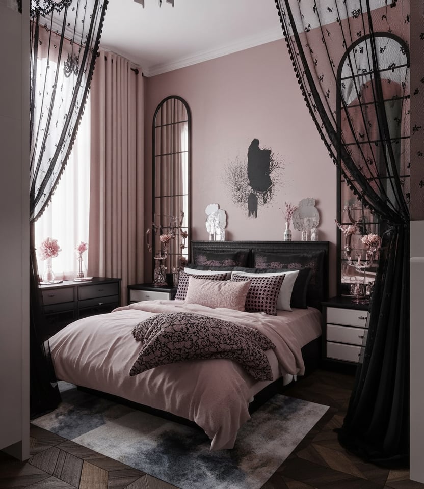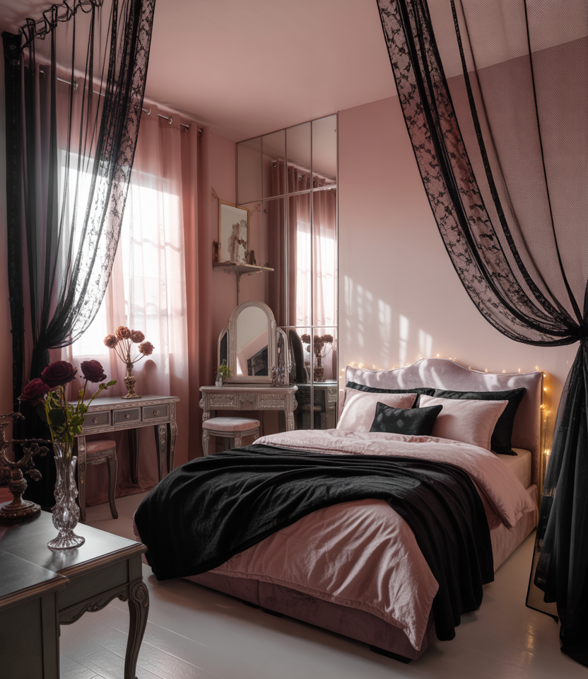 The goth trend evolves in 2026 with softer undertones—think black mixed with blush, lilac, or ice blue for a “pastel goth” aesthetic. Use black furniture against pastel walls, lace curtains, and crystal accents. It’s a surprisingly cozy blend of moody and cute. The contrast brings depth to small spaces, and mirrors double the perceived size. A DIY touch like painting furniture matte black personalizes it further.
