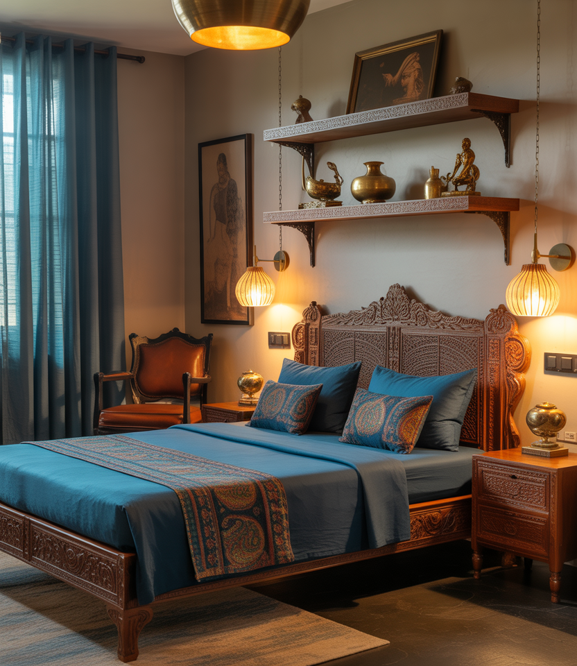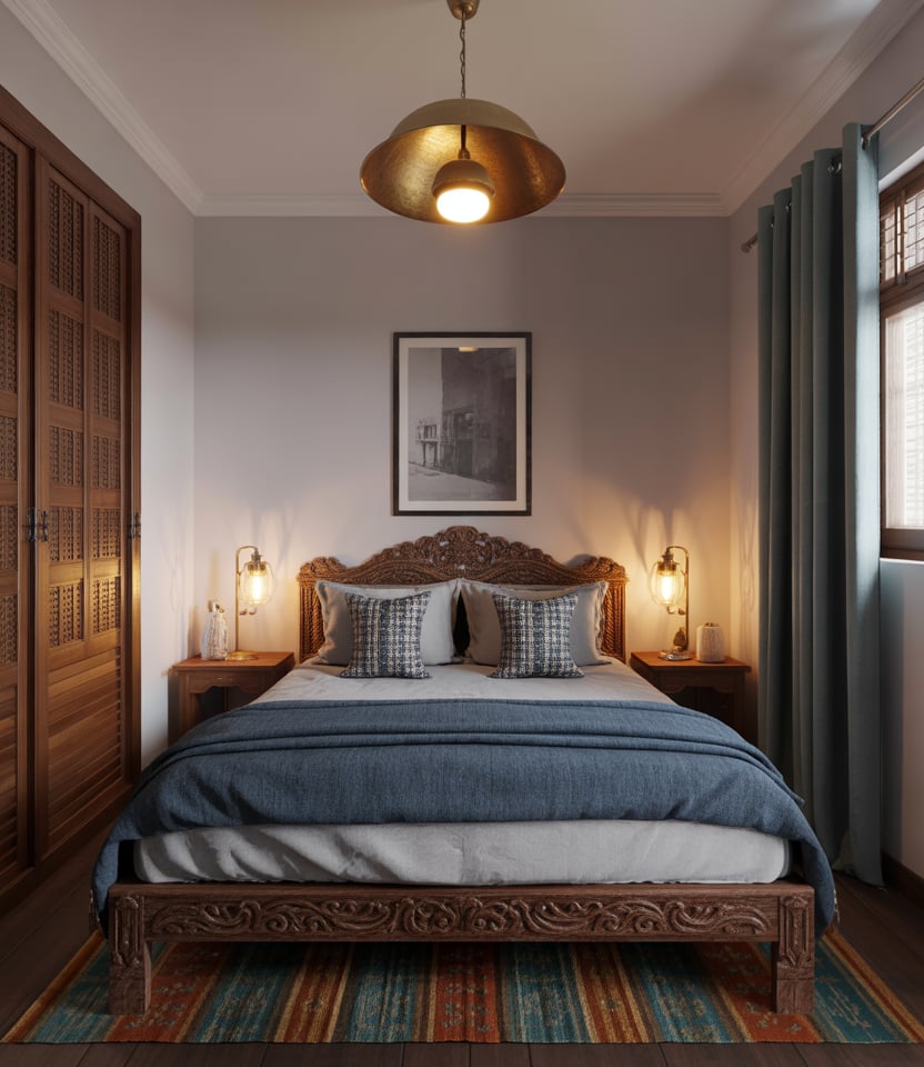 Combine Indian vibrancy with Western calm: think carved teak furniture, indigo textiles, and white linen bedding. This fusion style radiates warmth and balance, creating a cozy yet chic space. Use brass sconces and handmade pottery for soul, while the palette keeps the look harmonious. The mix of old-world charm and contemporary simplicity is timeless and budget-friendly, perfect for small multicultural homes.