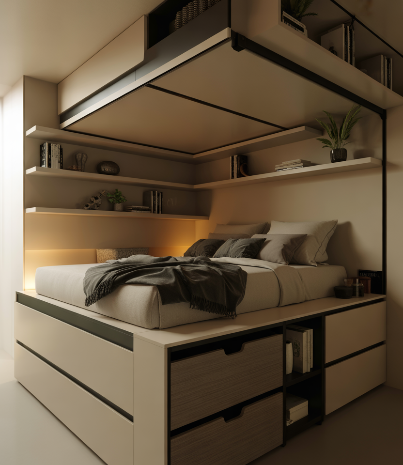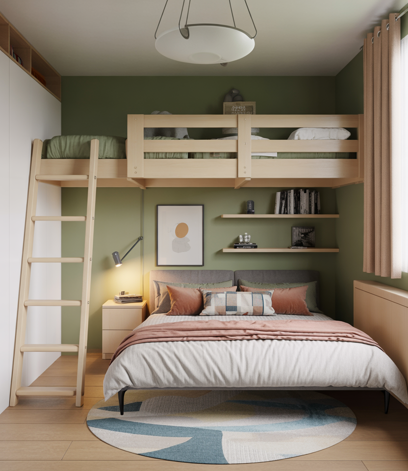 Here we explore using vertical space—ideal for 2 kids, couples, or a single occupant who wants a reading nook below the bed. A loft or mezzanine bed maximizes floor area, making a small room feel larger. Pairing this with organizing space-saving storage beneath the platform and floating shelves helps the room stay neat and functional. It’s a budget-friendly option if you DIY the structure or repurpose a loft bed frame. I remember visiting a friend’s tiny urban flat where the mezzanine bed allowed a compact home office below that felt like its own zone. That kind of clever use of space works beautifully here.