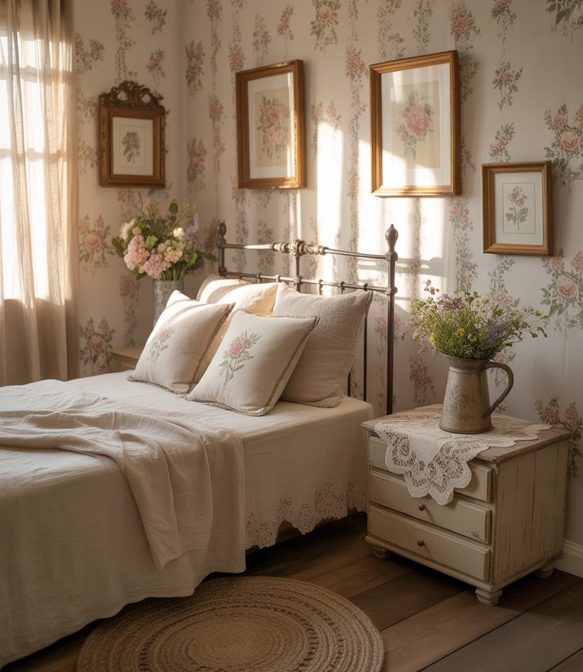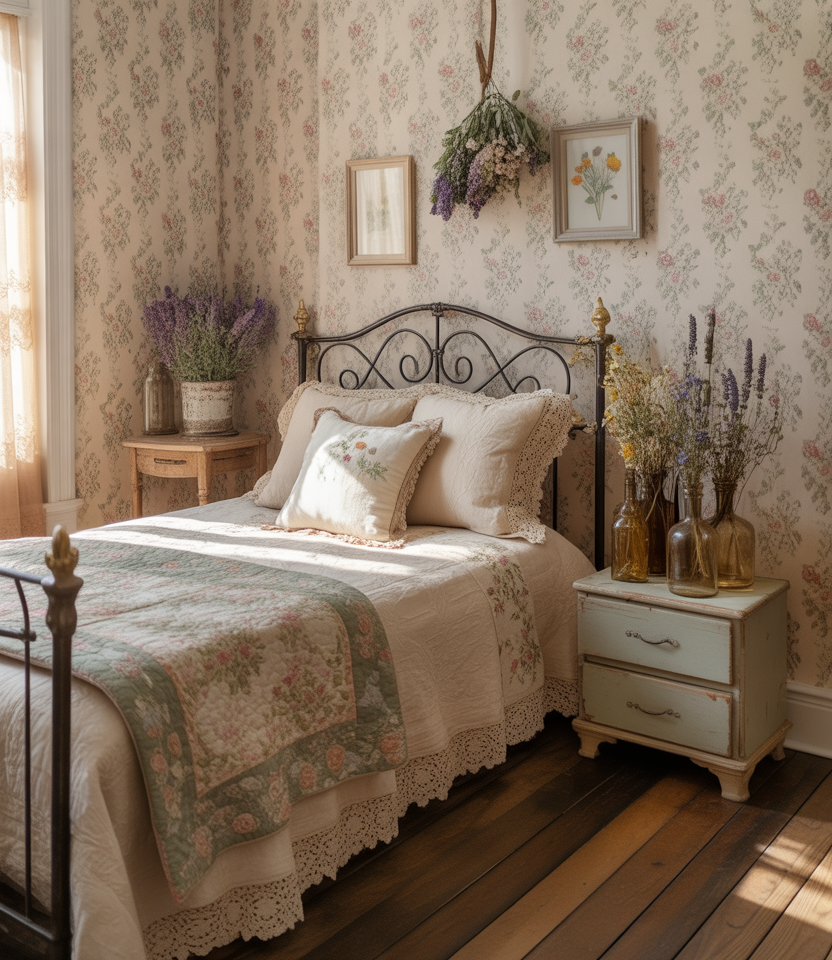 Cottagecore remains strong in 2026, especially in small bedrooms that crave romance. Combine floral wallpapers, ruffled linens, and vintage beds with modern storage solutions. Victorian touches—curved iron headboards or lace trims—make it uniquely nostalgic yet functional. Add a DIY gallery wall of pressed flowers for texture. The space feels cozy, homely, and deeply personal, proving small can be enchanting.