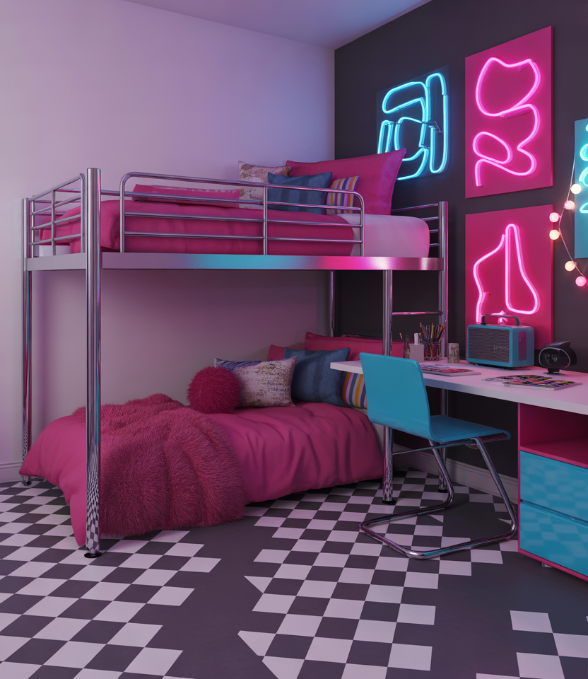 For creative teens, 2026’s retro revival means bold blocks of color, checkerboard patterns, and playful posters. Mix 70s orange with pink or sky blue for energetic balance. Use DIY wall decals and cheap second-hand finds for a quirky, cozy result. A loft bed and rolling desk maximize movement space, while LED neon art gives it that pop-culture aesthetic perfect for expression and fun.