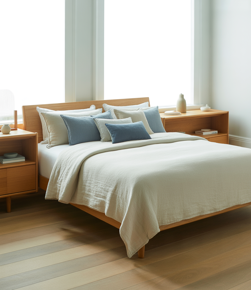 For anyone drawn to calm minimalism, a Scandinavian-inspired cozy retreat in blue and white tones never fails. Use a loaf-style low bed, linen bedding, and light oak furniture to create spaciousness. Wall hooks, built-ins, and hidden drawers embody organizing space-saving ideals. It’s perfect for couples or singles wanting tranquillity without excess—simple, tactile, and timeless.