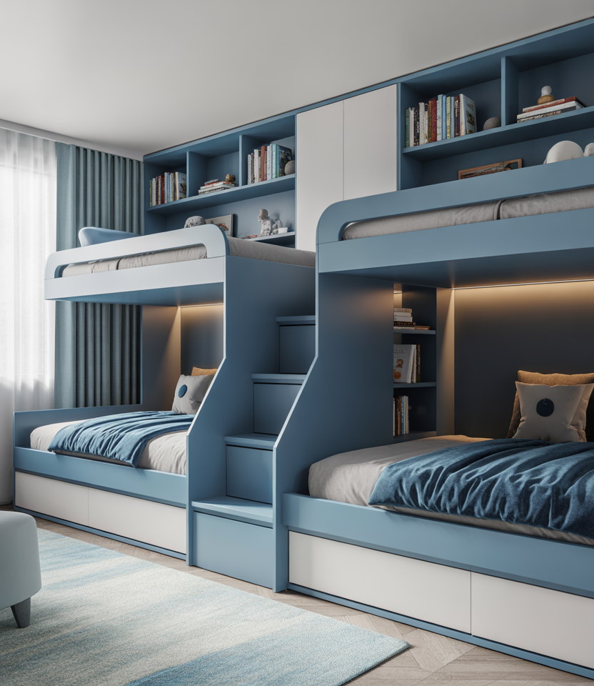 For families, the ultimate 2-kid solution is a custom bunk or corner-stacked bed. The 2026 trend favors minimalist builds with integrated shelving and curtains for privacy. Painted in soft women’s color schemes and blue color palettes, it feels airy and playful. DIY ladder handles and under-step drawers add practicality. The result: a cozy, joyful, and cheap fix for tiny family homes that still feel open.
