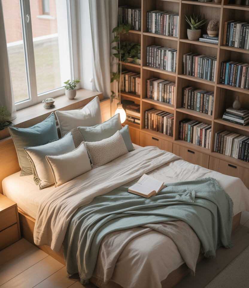 The Danish “Hygge” spirit thrives in tiny rooms, transforming them into cozy sanctuaries. Add a small reading nook with layered textiles, warm lighting, and soft blues or neutrals. A wall-mounted bookshelf doubles as décor and function. This budget-friendly idea suits teens, couples, or singles who crave comfort. It’s proof that simplicity and texture can outshine size.