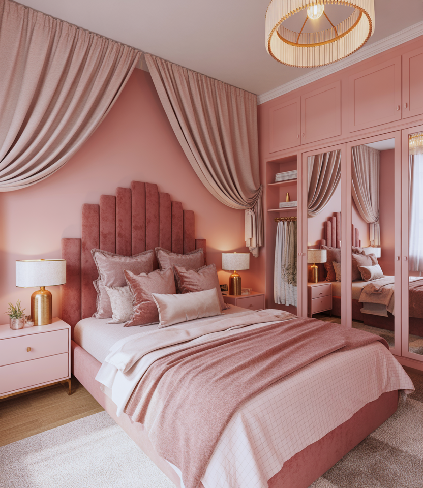 A cozy pink bedroom in 2026 feels elegant, not childish. Think rose velvet headboard, satin curtains, and soft gold lighting. Use mirrored wardrobes to stretch space and add glamour. The aesthetic suits women balancing function with flair—a cheap, DIY desk painted blush or rose elevates the look. Perfect for those who love polished feminine interiors without clutter.