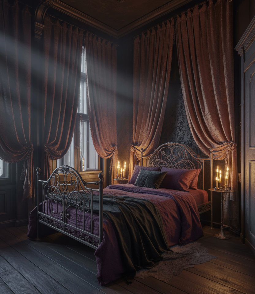 People who appreciate romantic darkness will adore the Victorian-goth fusion style of 2026. A wrought-iron bed, burgundy velvet, and candle sconces create intimacy. Add tall mirrors for space-saving organization and hidden drawers. Maintain décor that is moody yet warm since it’s cozy, timeless, and deeply expressive. Works equally well for artistic couples desiring to experience history and emotion in their haven or for solo dreamers.