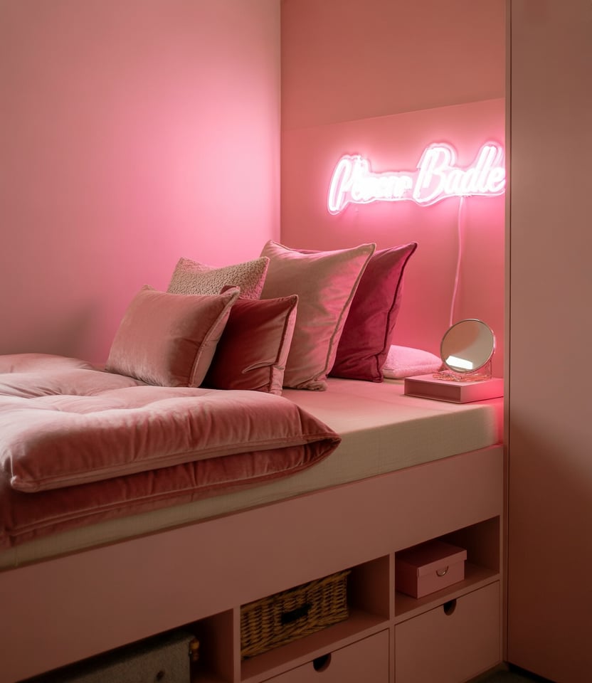 For those seeking a more playful, fashionable vibe, consider a cozy pink and bold “baddie” aesthetic in a small bedroom. This works especially well for a woman’s color schemes and color palettes and blue- or pink-themed décor: think blush or millennial pink walls, velvet cushions, a cozy single bed, a neon sign, and smart storage tucked under the bed. The key is to balance trendiness with comfort: layer textures (plush rugs, throw pillows) and maintain smart storage so the small footprint doesn’t feel chaotic. A medium-sized chandelier or ambient string lighting can raise the sense of height and luxury in the compact room. While this style leans playful, make sure the fundamentals—good layout, accessible storage—are solid.