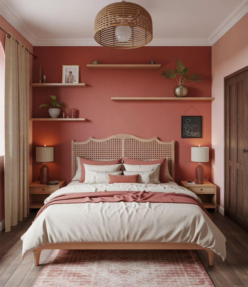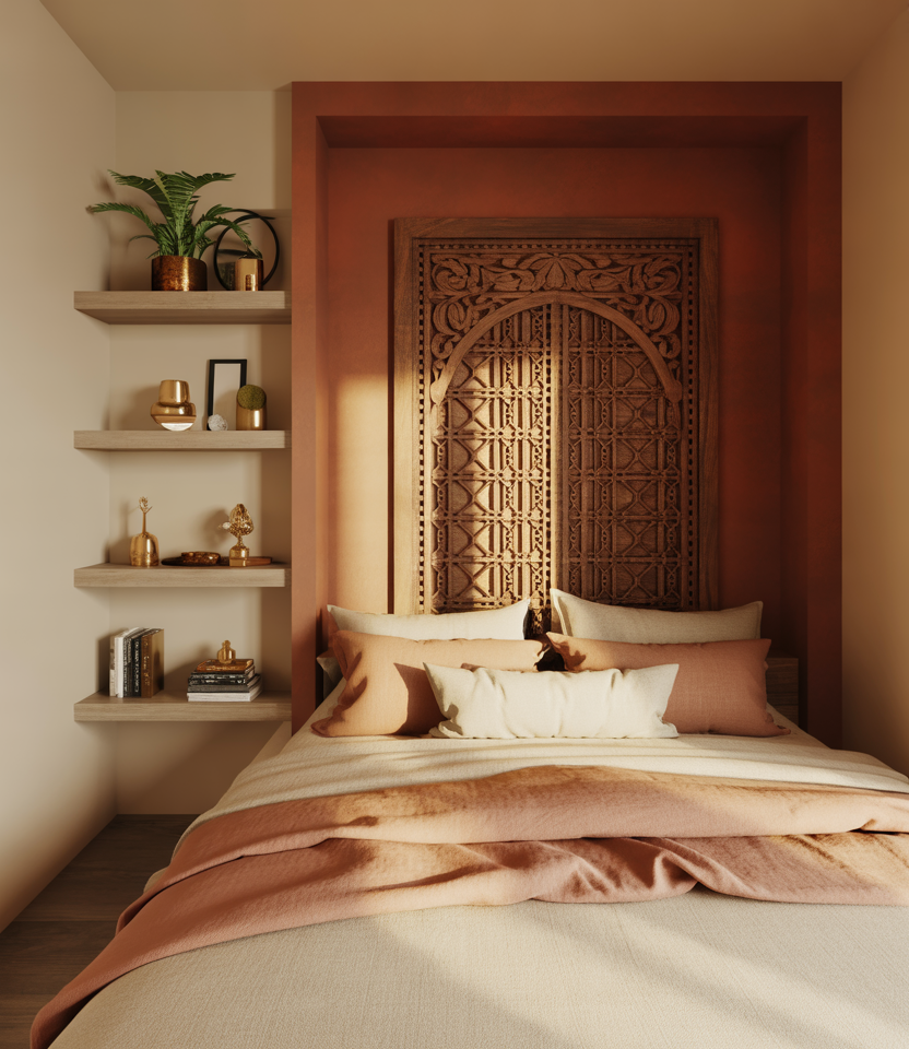 This idea draws on heritage and minimalism: combining Indian color palettes, textures, and decorative elements in a small bedroom for a warm, globally inspired sanctuary. For example, a rich terracotta accent wall, a wooden jali pattern headboard, a textured linen duvet, and brass lantern-style lighting give personality without excess. To keep things compact, opt for a low platform bed, floating nightstands, and wall-mounted shelving. This cozy yet curated space resonates with the 2026 trend toward spaces that feel collected and personal. Martha Stewart + 1 It works for anyone seeking a tranquil retreat, whether a single occupant, a couple, or even a teen wanting global flair.