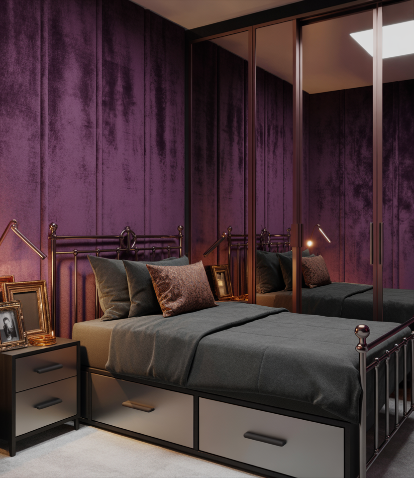 For a solo occupant who relishes drama, go all out with a goth-tinged small bedroom featuring black or deep plum walls, a cozy velvet single bed, metallic accent lighting, and mirrored panels that reflect light, making the space feel larger. You can keep décor to a minimum so the small space doesn’t feel overwhelming: just one statement headboard, one chandelier or pendant light, and bed storage hidden from view. The dark palette plays to 2026’s love of richer neutrals. Livingetc+1 This is ideal for anyone who craves bold aesthetics yet still manages to be practical through intelligent organization and space-saving furniture.