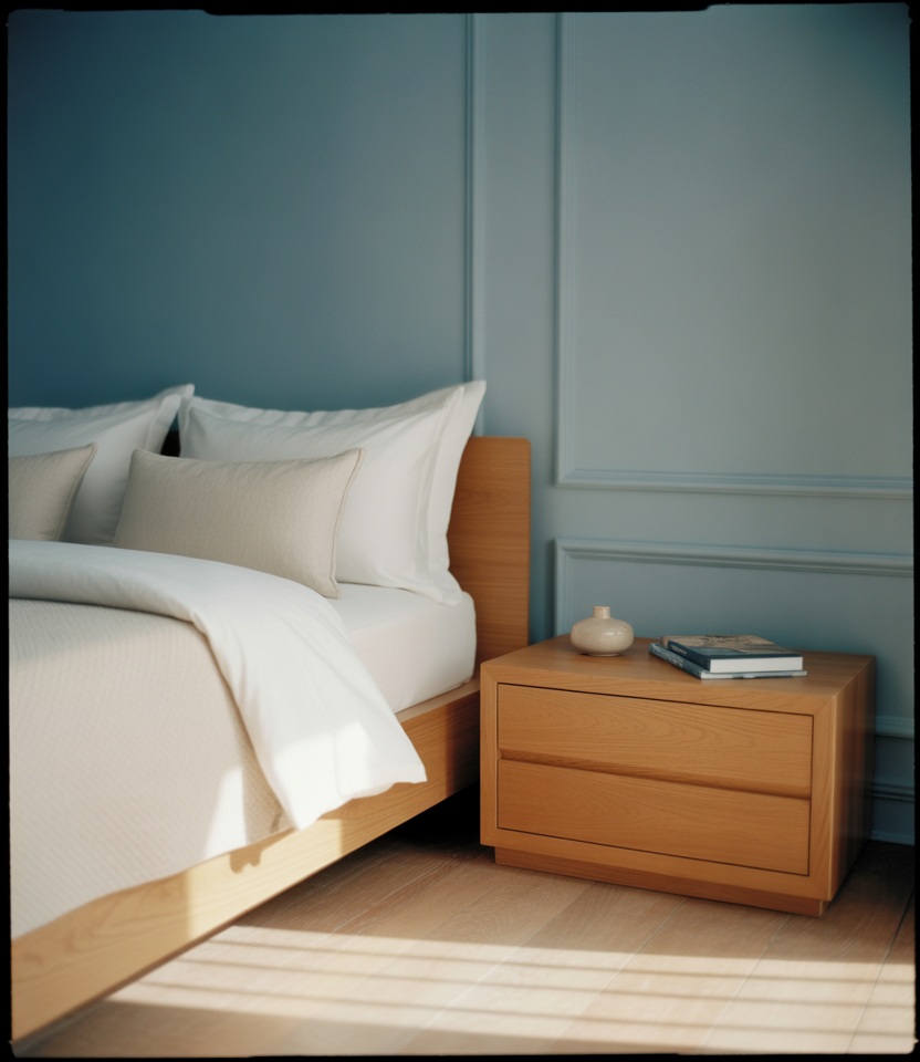 The final trend is pairing a soft blue with warm neutral tones to create calm with a quiet sophistication. What many would consider the best version of modern bedroom luxury is an airy and effortless blend of soft color.