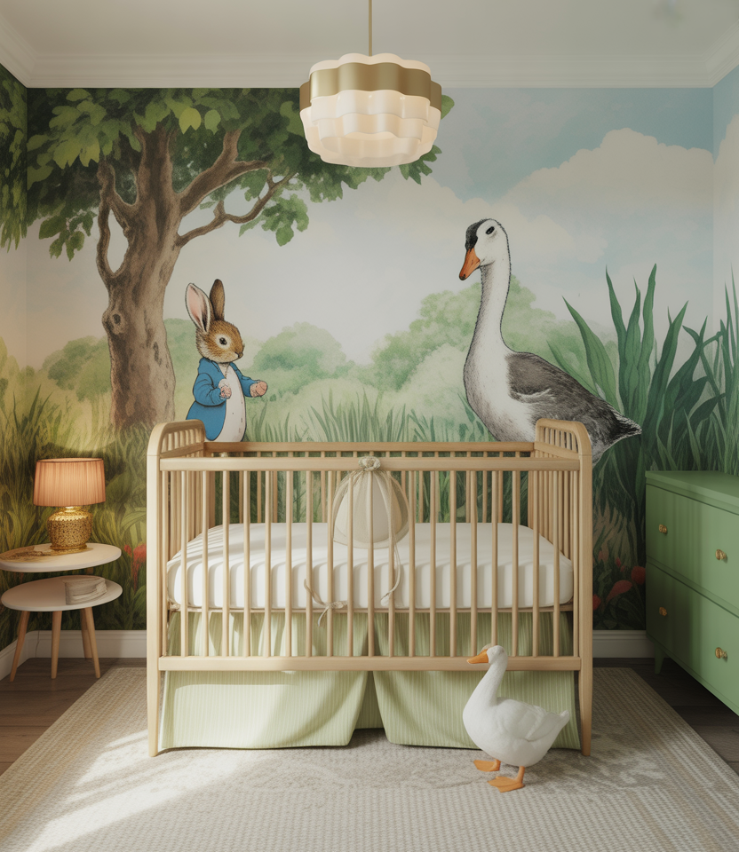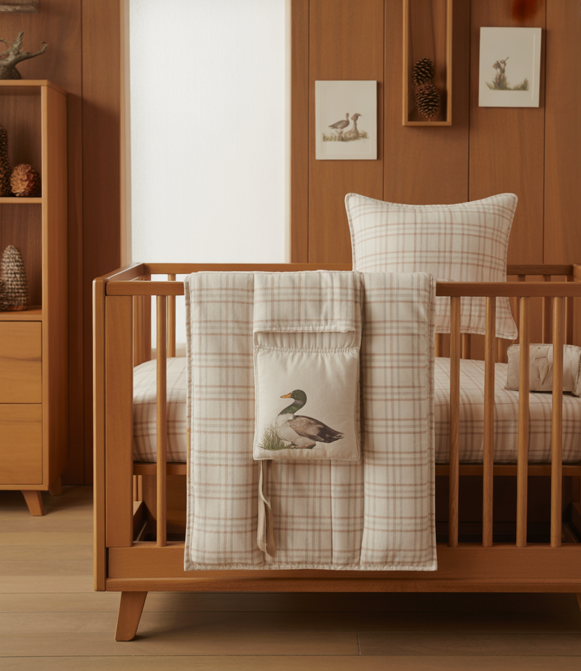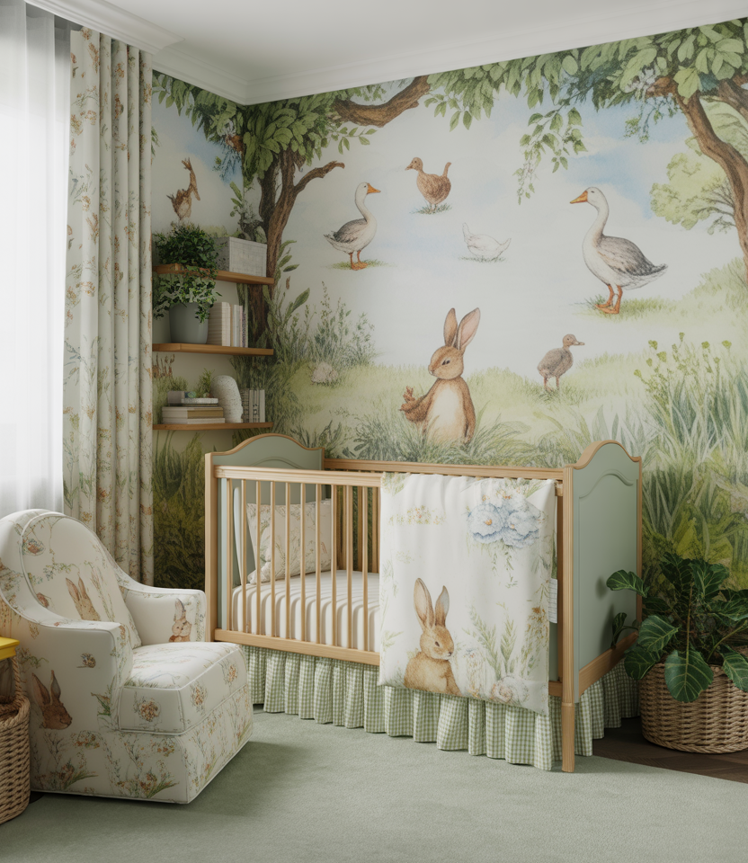 Think mountains, rivers, and forest nature, paired with jungle touches for energy. Add a Peter Rabbit moment here—a framed print or bunny lamp for sweetness. Layer fabrics, bring in a grand millennial quilt, and maybe a playful goose or duck hunting motif on a throw pillow. A coastal woven crib or a gold crib gives polish, and an accent wall keeps it curated—not cluttered.