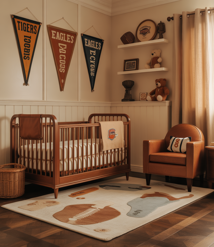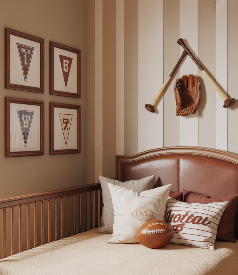 A vintage sports nursery nods to little athletes with framed pennants, worn-leather details, and classic baseball or Think block numbers, varsity stripes, and warm neutrals to keep it polished and not theme-park loud.
