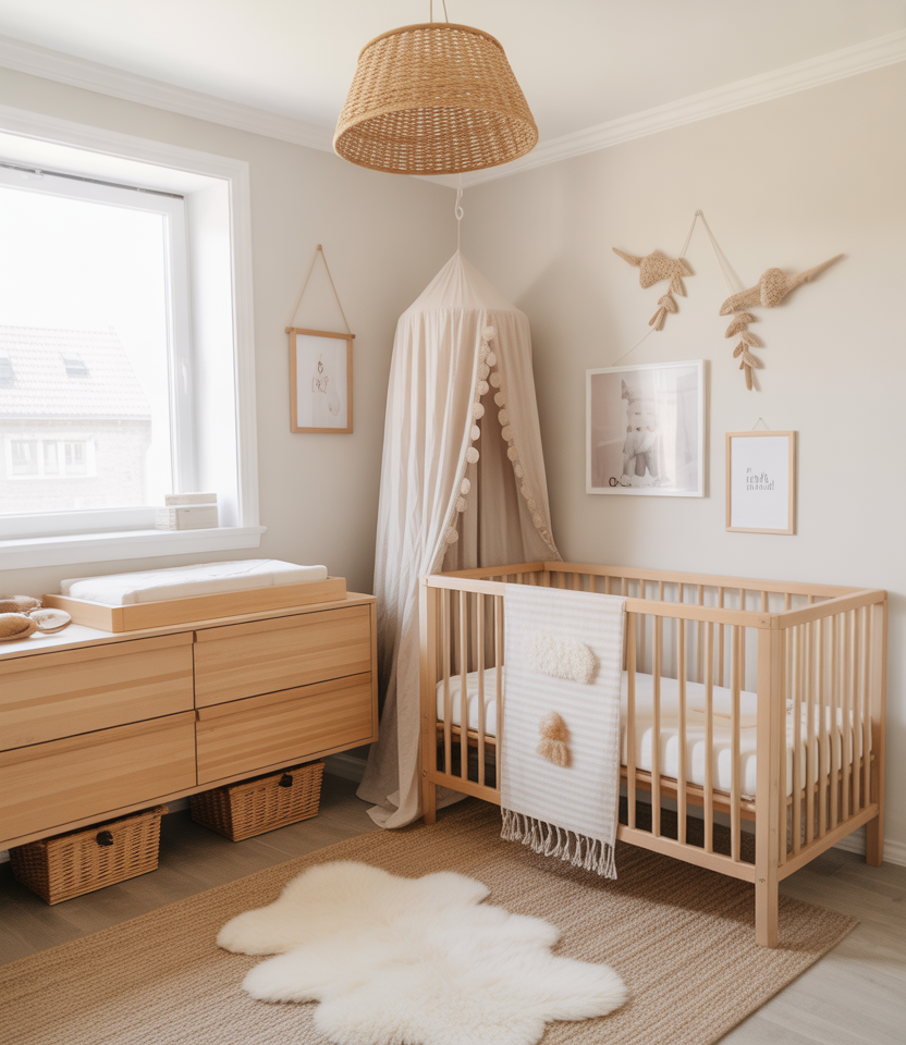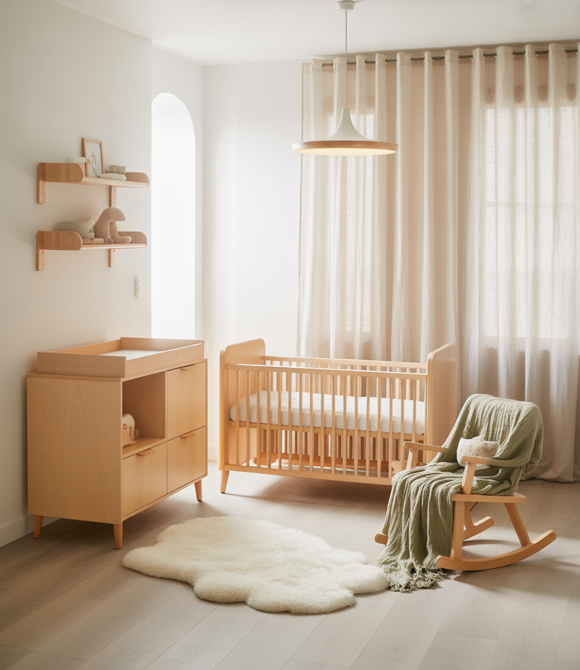 A Scandinavian-inspired nursery balances airy white walls, natural oak, and cloud-soft linens. It feels intentional and uncluttered—perfect for parents who love simplicity and cozy hygge vibes. Add wool blankets and a sheepskin rug for warmth without fuss. This style grows easily into toddlerhood, proving that less really can feel like more.