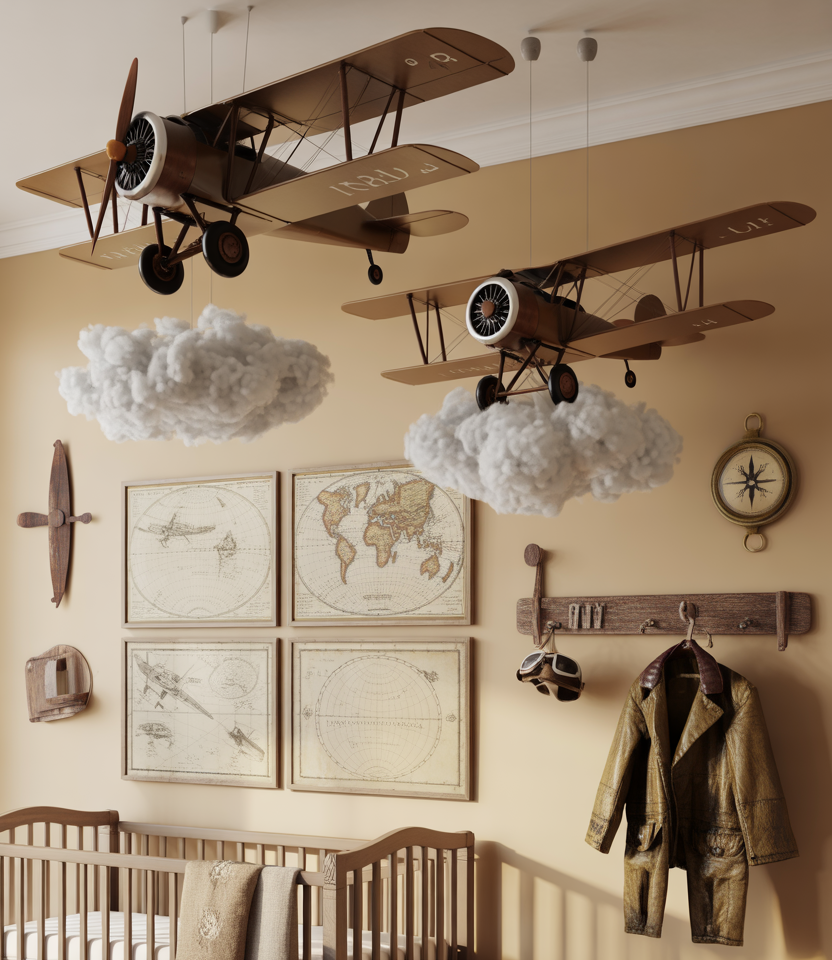Little aviators will love vintage planes, cloud mobiles, and brushed-metal décor. Lean into sepia tones and soft denim blues rather than loud cartoon jets. I once placed an old propeller replica above shelving—suddenly the room felt like a tiny hangar with heart. It feeds curiosity and pairs well with travel books and maps.
