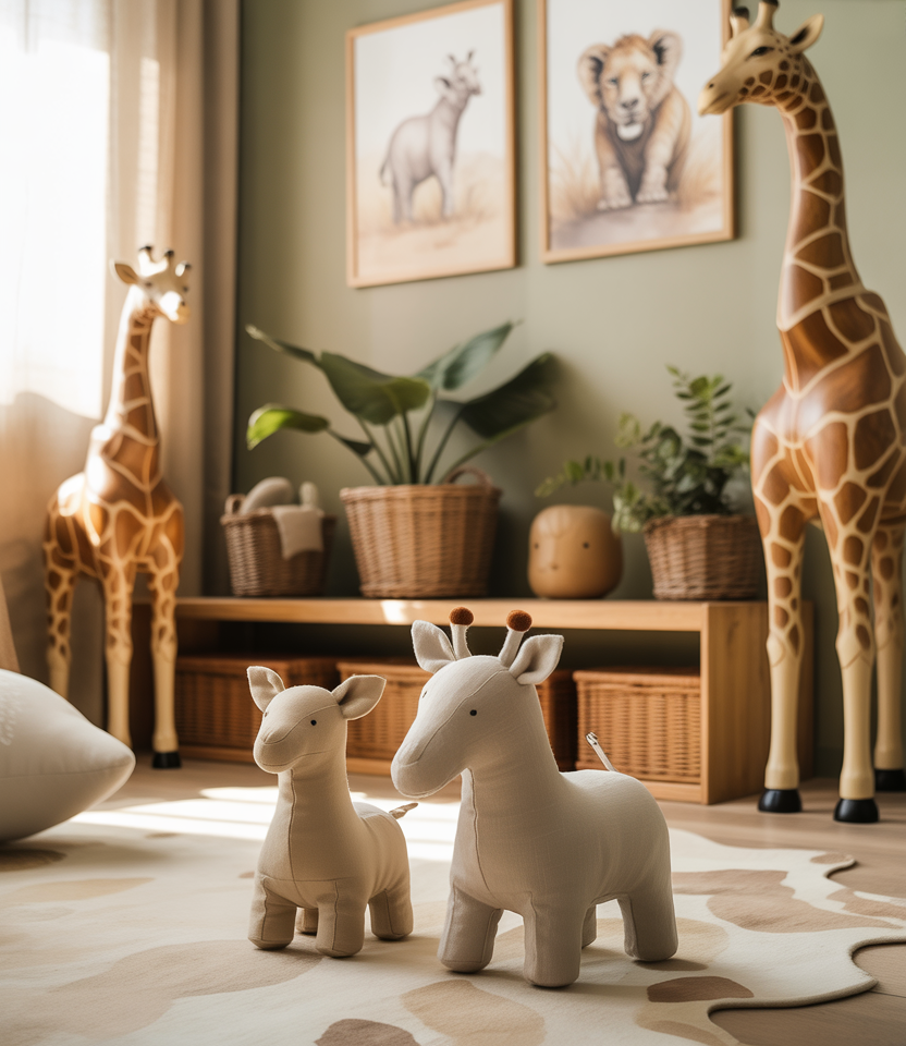 A safari nursery welcomes soft animal silhouettes, sandy tones, and leafy textures. Think linen lions and wooden giraffes, not big-box cartoon prints. Greenery brings life, while rattan baskets nod to natural safari camps. I remember a client adding a hand-drawn map—it became the bedtime conversation starter.