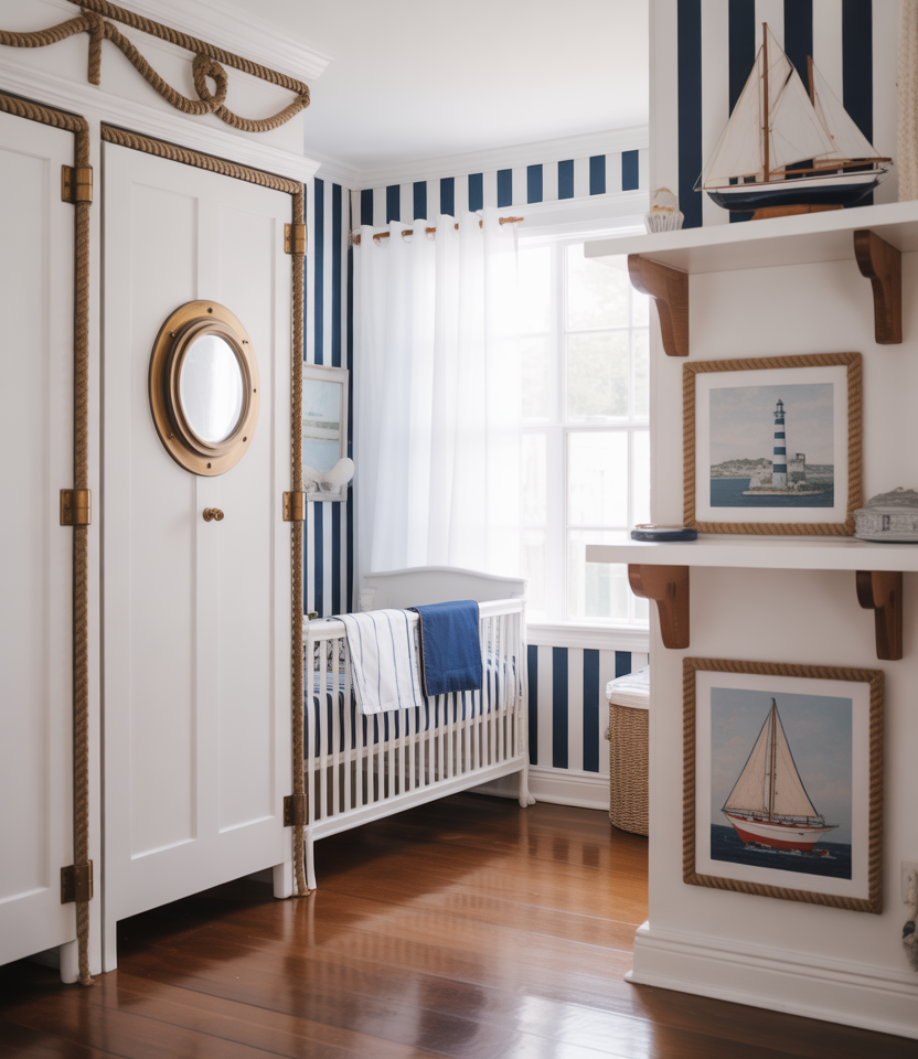This style blends navy stripes, rope accents, and brass finishes inspired by coastal towns. Unlike the breezy ocean theme, this skews traditional coastal sailing charm. Add model boats, knot art, and crisp whites for a crisp maritime look. A friend from Maine once gifted lobster-buoy hooks—functional and charming.