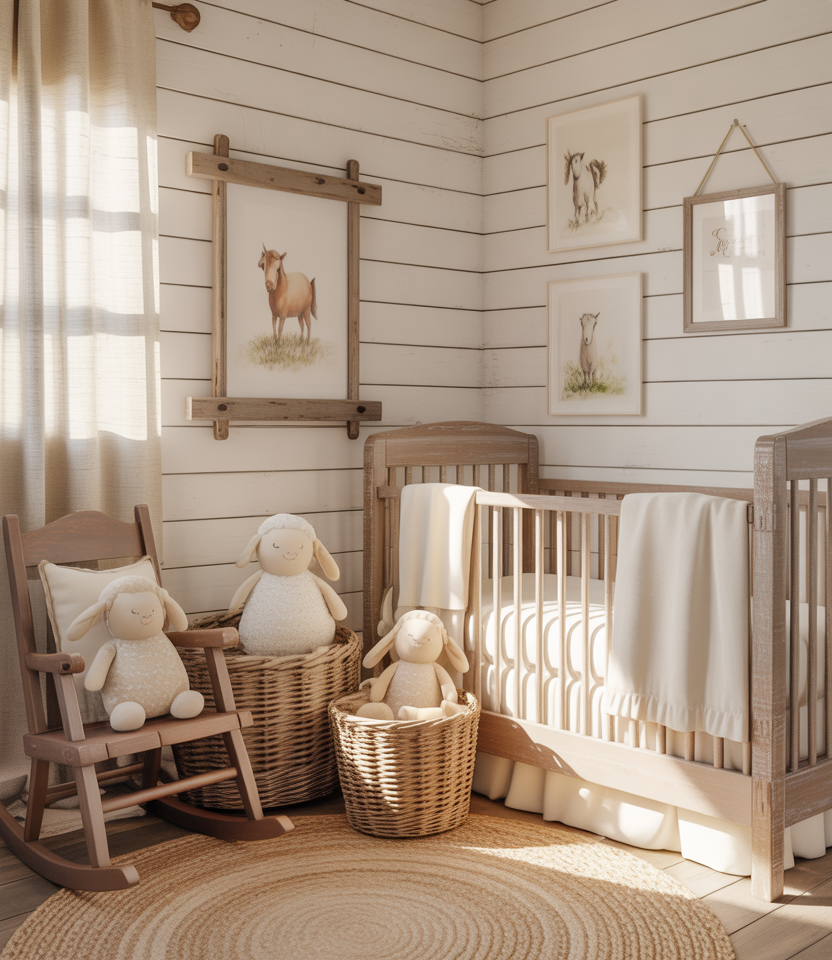 This nursery pairs shiplap, creamy neutrals, and soft farm motifs like lambs and ponies. Picture antique baskets for toys and weathered wood frames. The design combines wholesomeness with modern farmhouse polish, which is especially loved by fans of Chip and Joanna. Sweet, inviting, and grounded in country-life nostalgia.