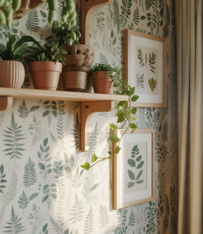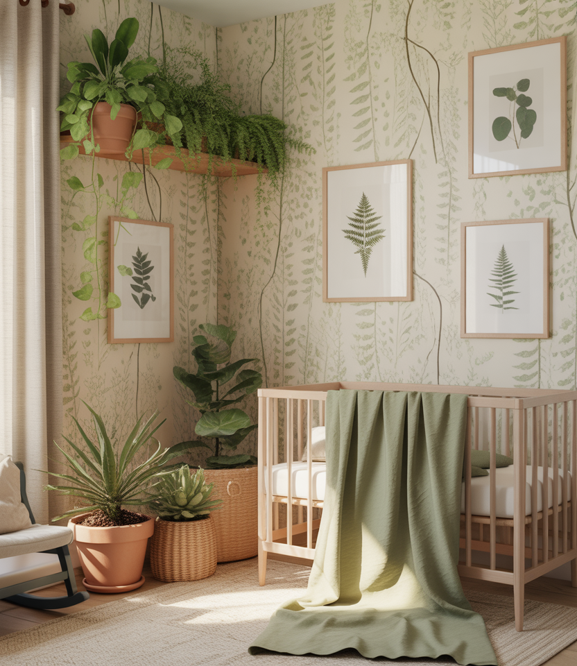 For plant-loving parents, a botanical room blends leafy wallpaper, terracotta touches, and earthy greens. Use safe faux vines and framed pressed leaves to keep it baby-friendly. When I dried clover from a family yard and framed it, it became a keepsake forever tied to home. Fresh, grounding, and calming.