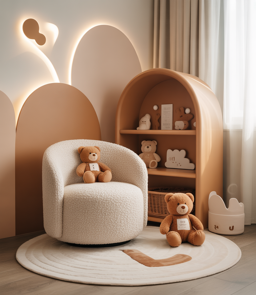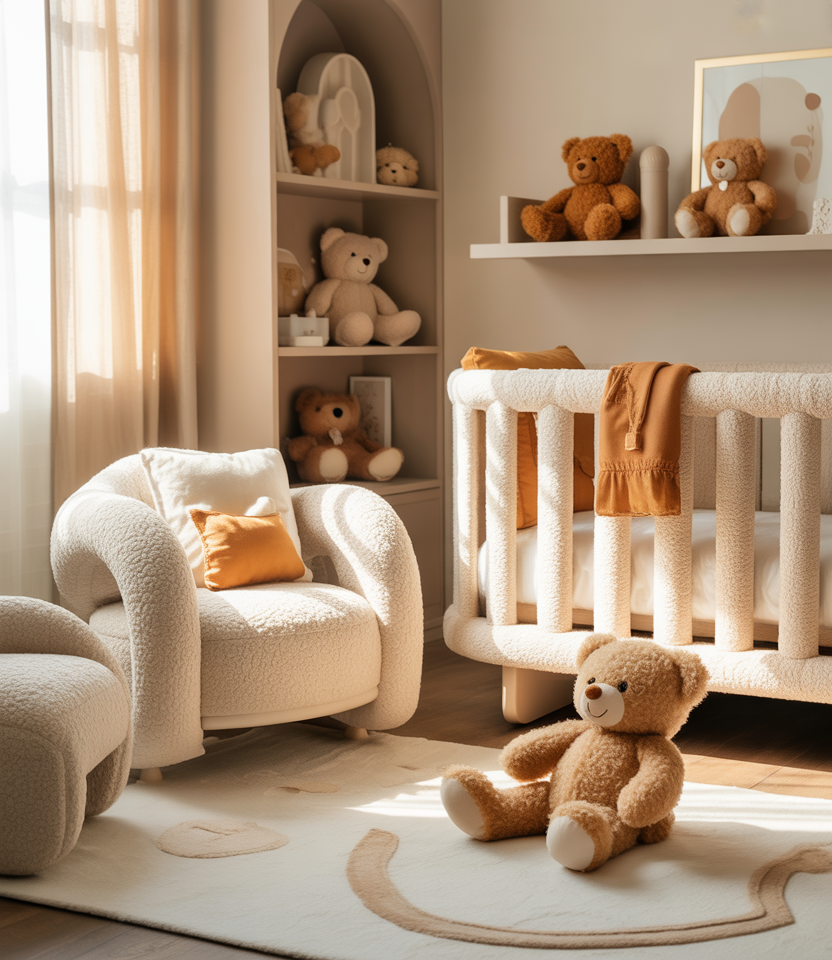 A teddy bear nursery celebrates warmth and innocence, mixing plush textures, caramel tones, and gentle curves. Use boucle rockers, knit blankets, and a teddy bear baby motif stitched into pillows. My aunt always gifted handmade bears; one sat on every crib in the family. Soft browns and cream walls keep this timeless and calm—perfect for parents craving comfort and simplicity.