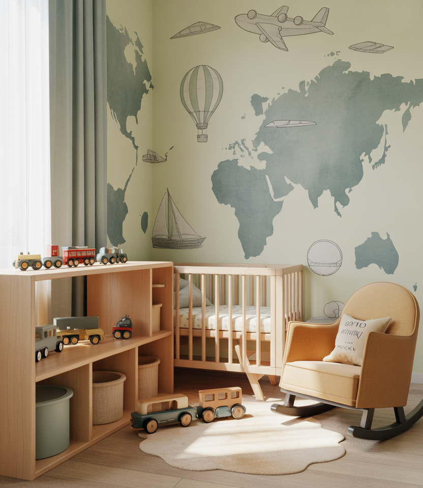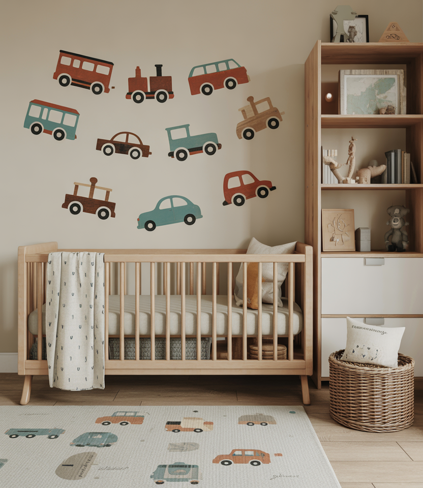 This playful design mixes trains, buses, and vintage cars in a muted palette so the theme stays stylish, not chaotic. Think canvas prints, wooden vehicles, and map accents. My nephew still treasures a wooden train engraved with his birth year—simple touches make memories. Balanced, fun, and educational.