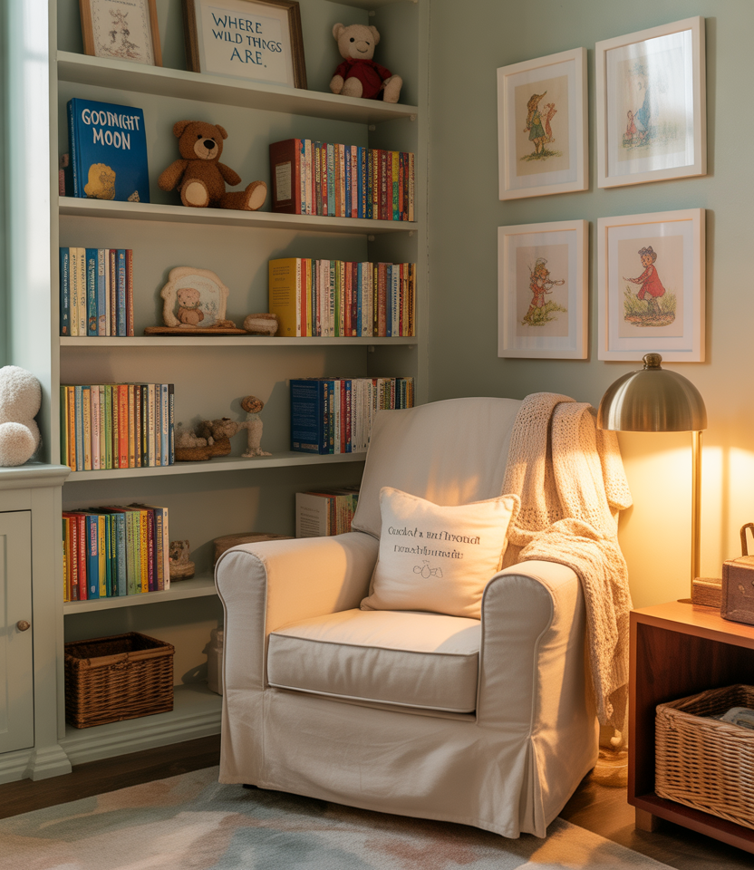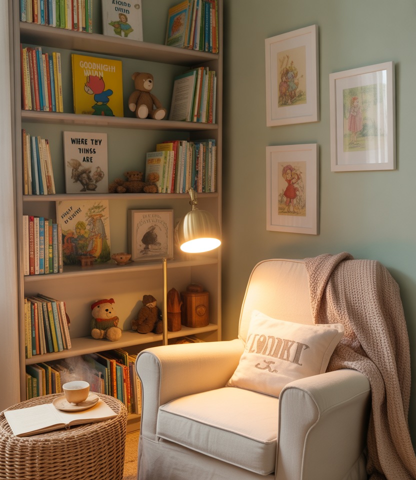 A literary nursery celebrates imagination with shelves of classics, cozy reading chairs, and soft lamp light for bedtime tales. Frame vintage book covers or family-favorite pages for nostalgic charm. I once saw parents embroider a baby’s initials on a book pillow—simple magic. Keep colors warm and neutral so books and personal mementos shine as the heart of the room.