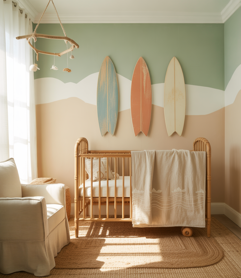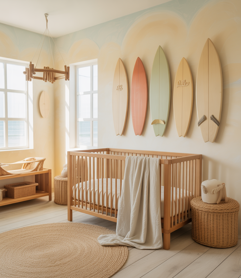 A breezy surf-inspired nursery brings laid-back California vibes with sun-faded blues, surfboard wall art, and weathered wood textures. Unlike traditional coastal navy themes, this look leans beach-boho and relaxed. A friend hung a tiny thrifted surfboard on the wall and added linen curtains—it instantly felt summer-soft and carefree.