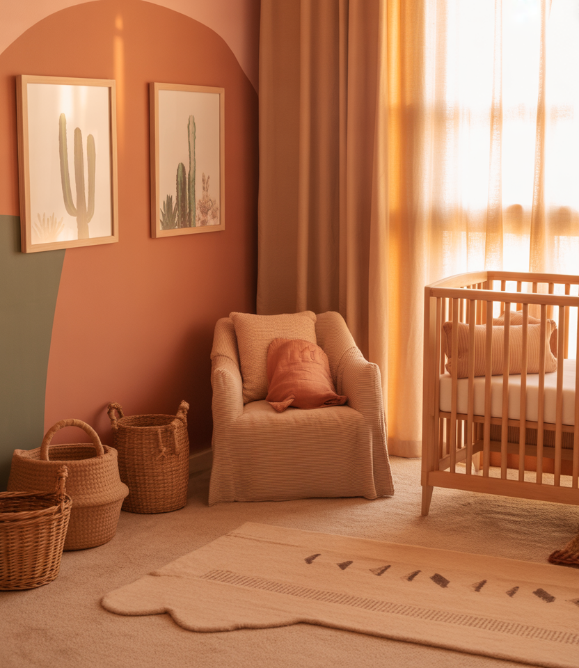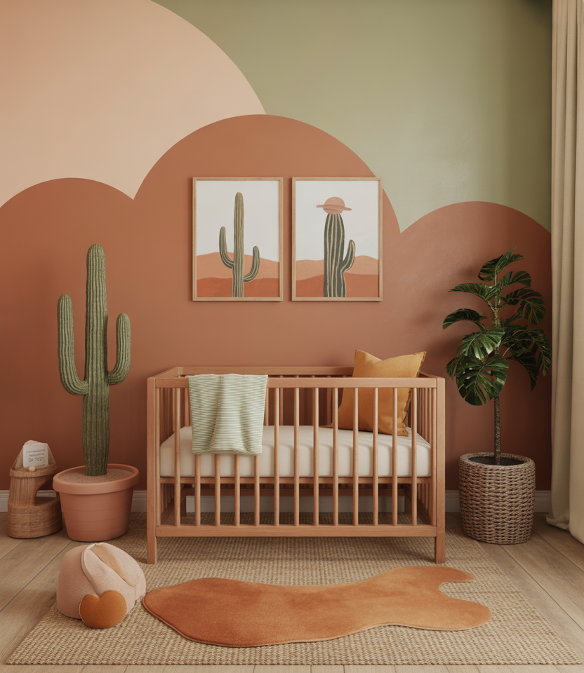 A desert nursery uses clay tones, sage green, and sun-washed neutrals inspired by desert mesas. Add woven art, cactus prints, and a warm terracotta rug. The gentle monochrome palette feels naturally soothing—I once saw a sand-colored crib canopy transform a small space into a cozy cocoon. The design is earthy, calm, and modern-western, without resorting to cowboy clichés.