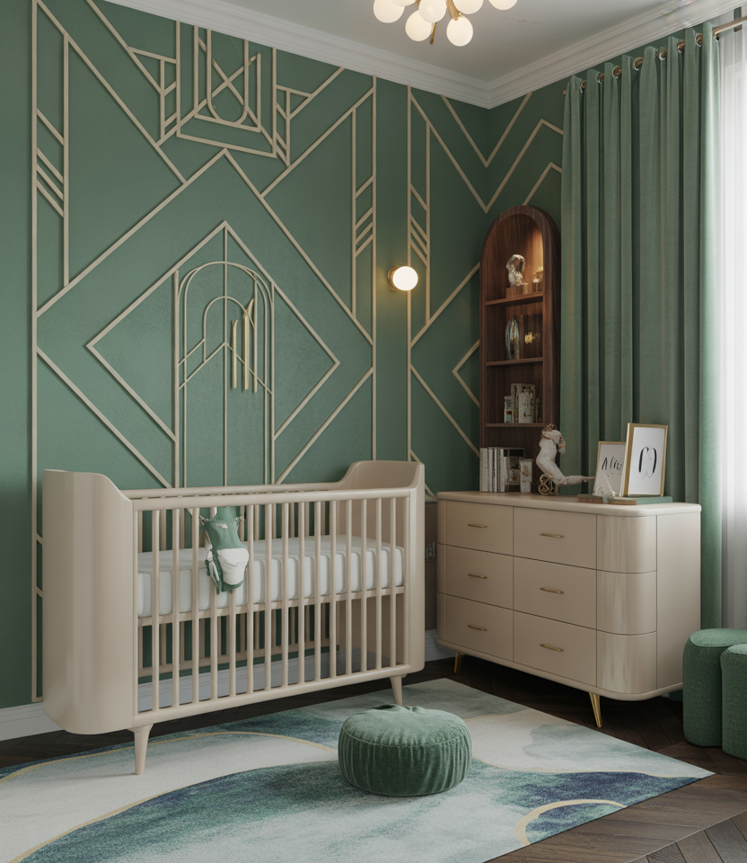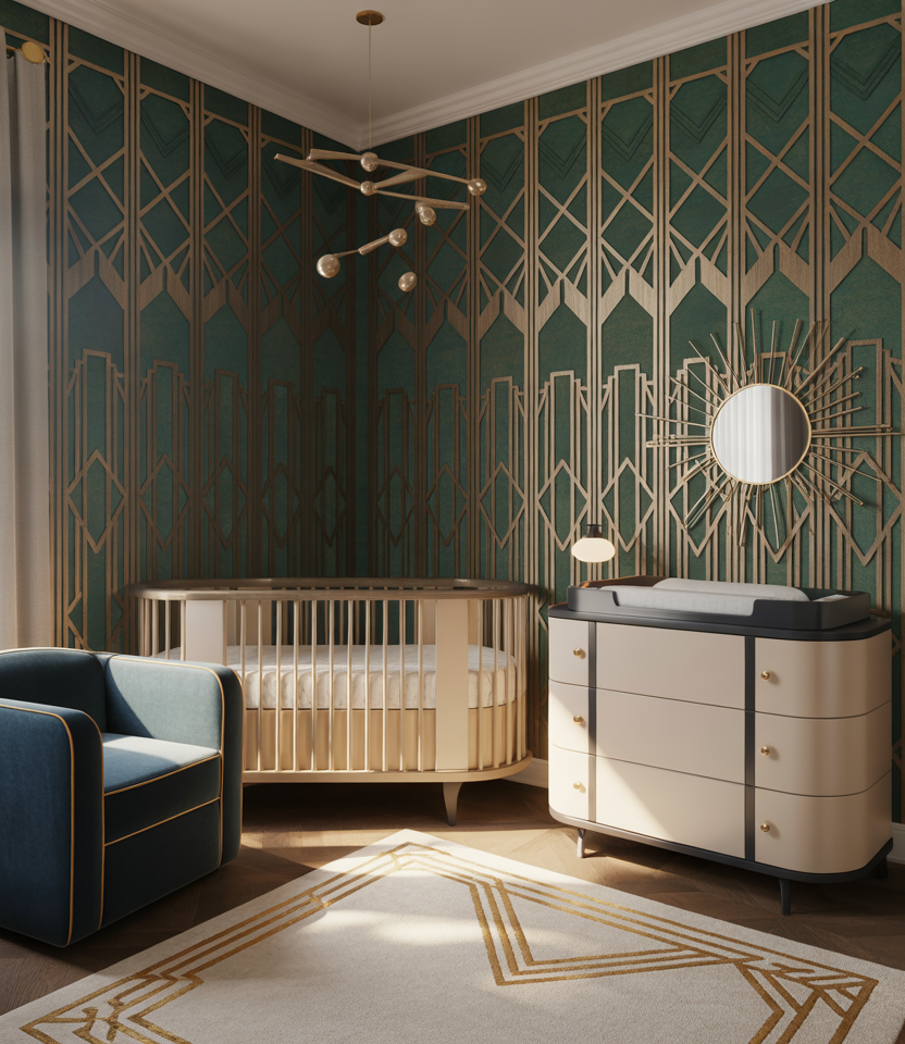 For parents craving sophistication, an Art Deco nursery mixes curved silhouettes, geometric wallpaper, and brushed gold accents. Deep emerald or midnight blue adds drama while staying baby-calm. I worked on a space where parents repurposed a vintage bar cart into a diaper station—unexpected and chic. The design is elegant yet soft enough for a nursery.