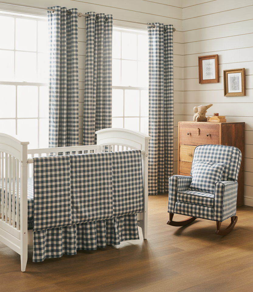 A checkered nursery brings playful geometry and classic charm. Pair gingham bedding with wood shelves and soft navy accents for a balanced look. This style nods to farmhouse warmth without going full country—think Ralph Lauren meets modern baby boutique. These bears are practical, cheerful, and unfussy, making them ideal for parents who appreciate tradition with a modern twist.