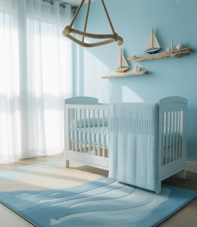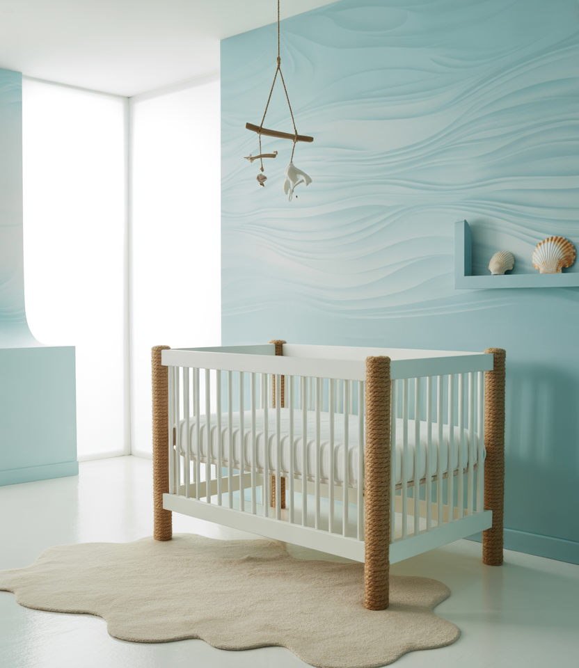 An Ocean nursery embraces coastal airiness with watery blues, seashell neutrals, and wave-like textures. It’s less beach-boardwalk and more breezy lighthouse calm. I once painted soft ombré waves for a client, and she swore rocking babies felt smoother there. This palette soothes parents and newborns alike, ideal for homes craving serenity.